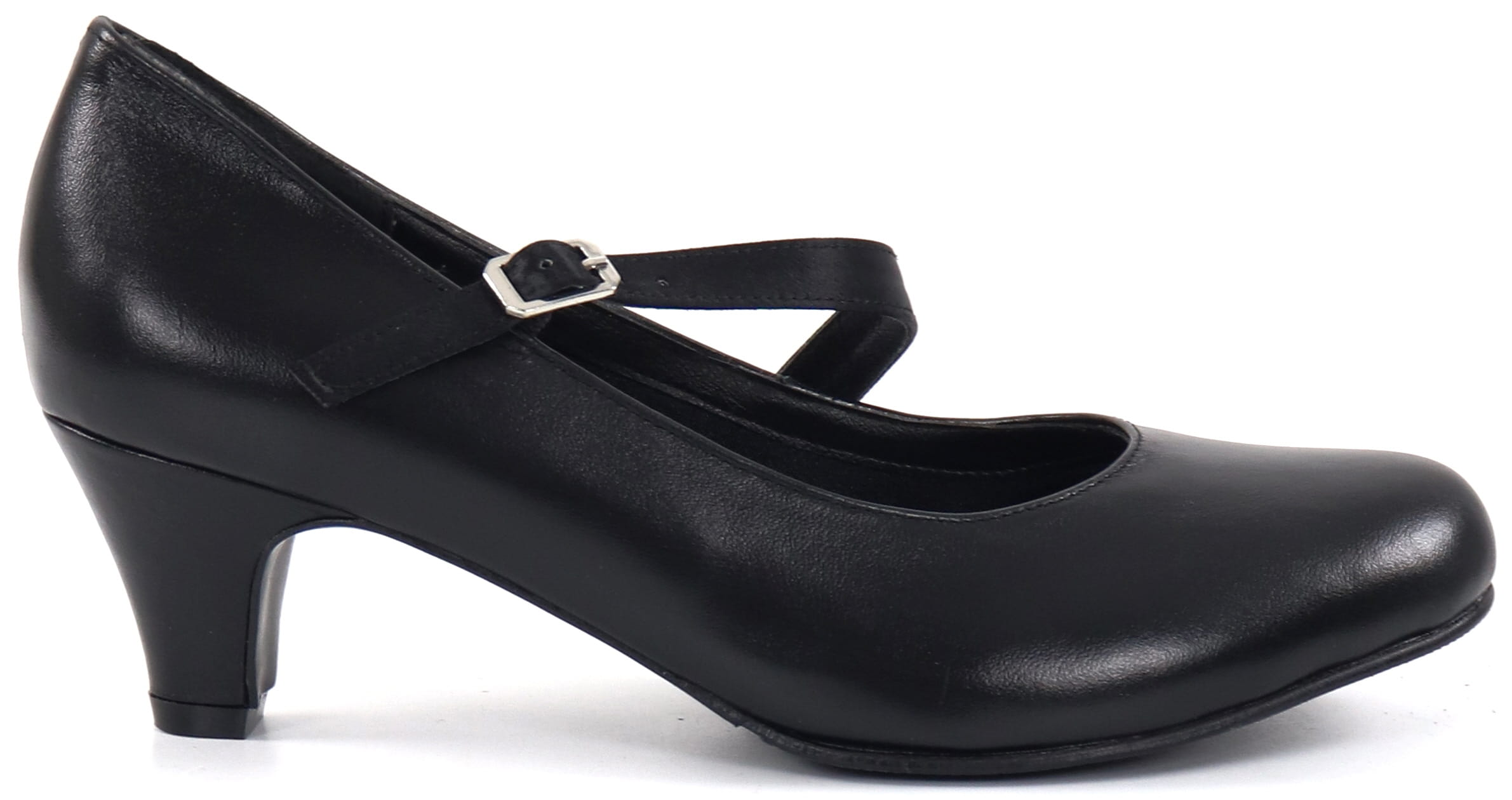 Svarta pumps i läder med en justerbar, tunn rem. En tidlös modell som passar till många olika outfits.
