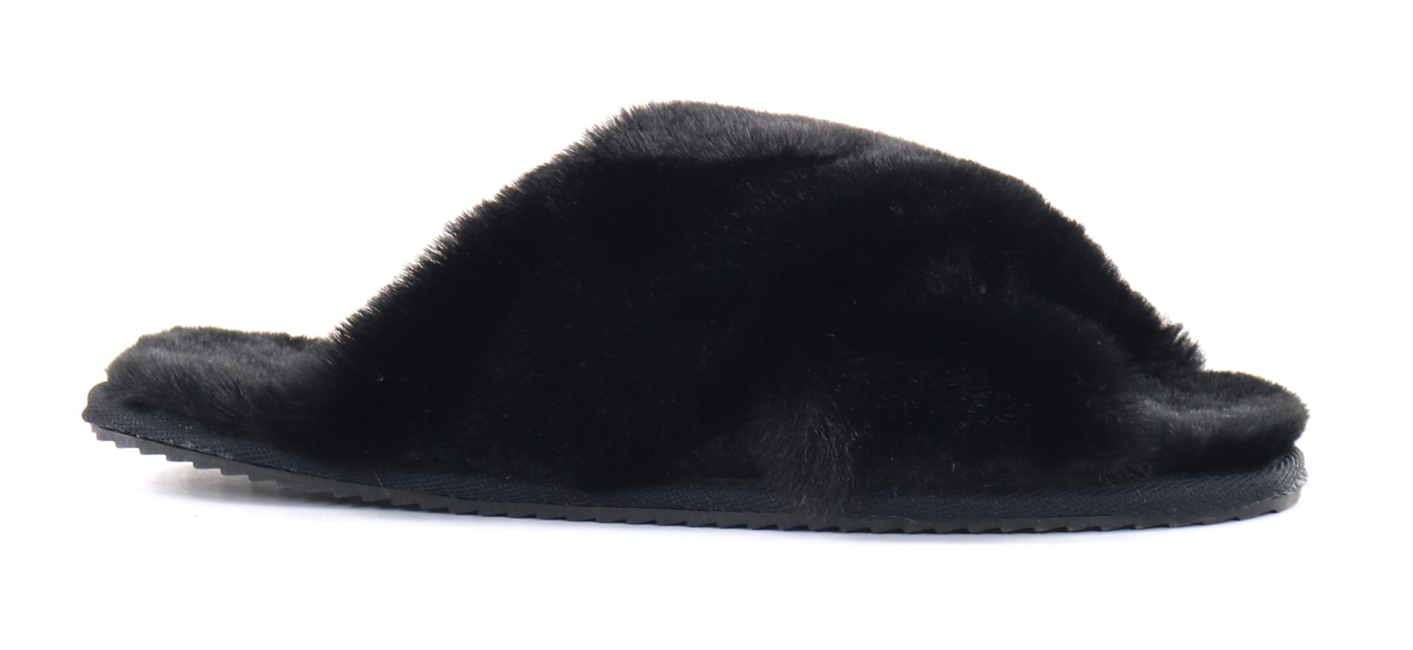 Låga slip-in-sandaler gjorda av fuskpäls.