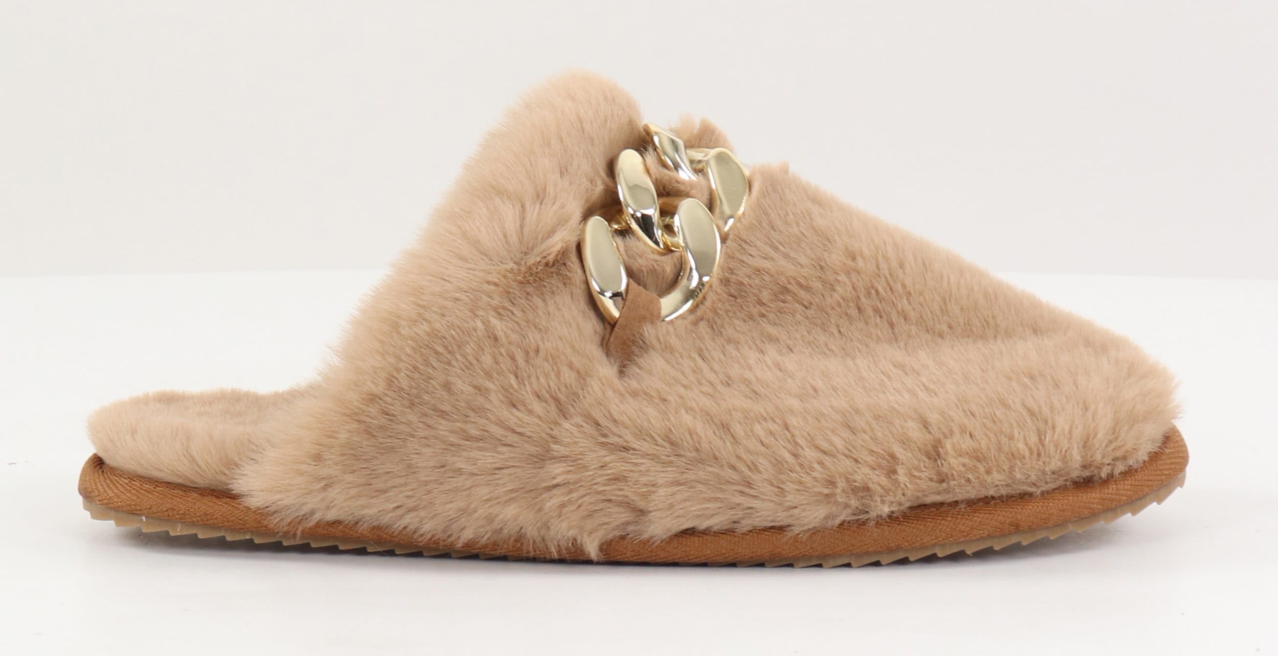 Slip-in-tofflor gjorda av mjuk fuskpäls, guldfärgad dekorativ kedja på toppen.