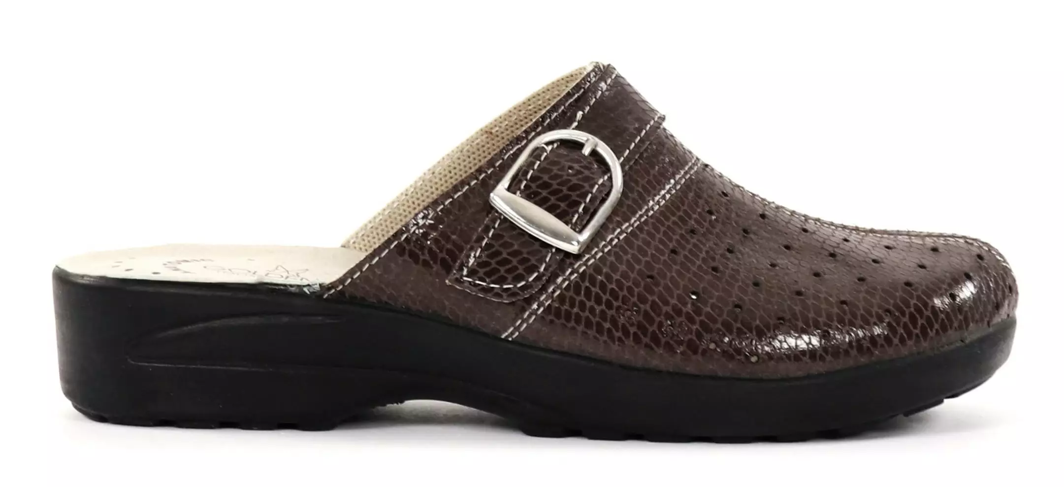 Glänsande bruna mulor med anatomiskt formade innersulor som säkerställer en utmärkt passform och gör dem mycket bekväma att bära.