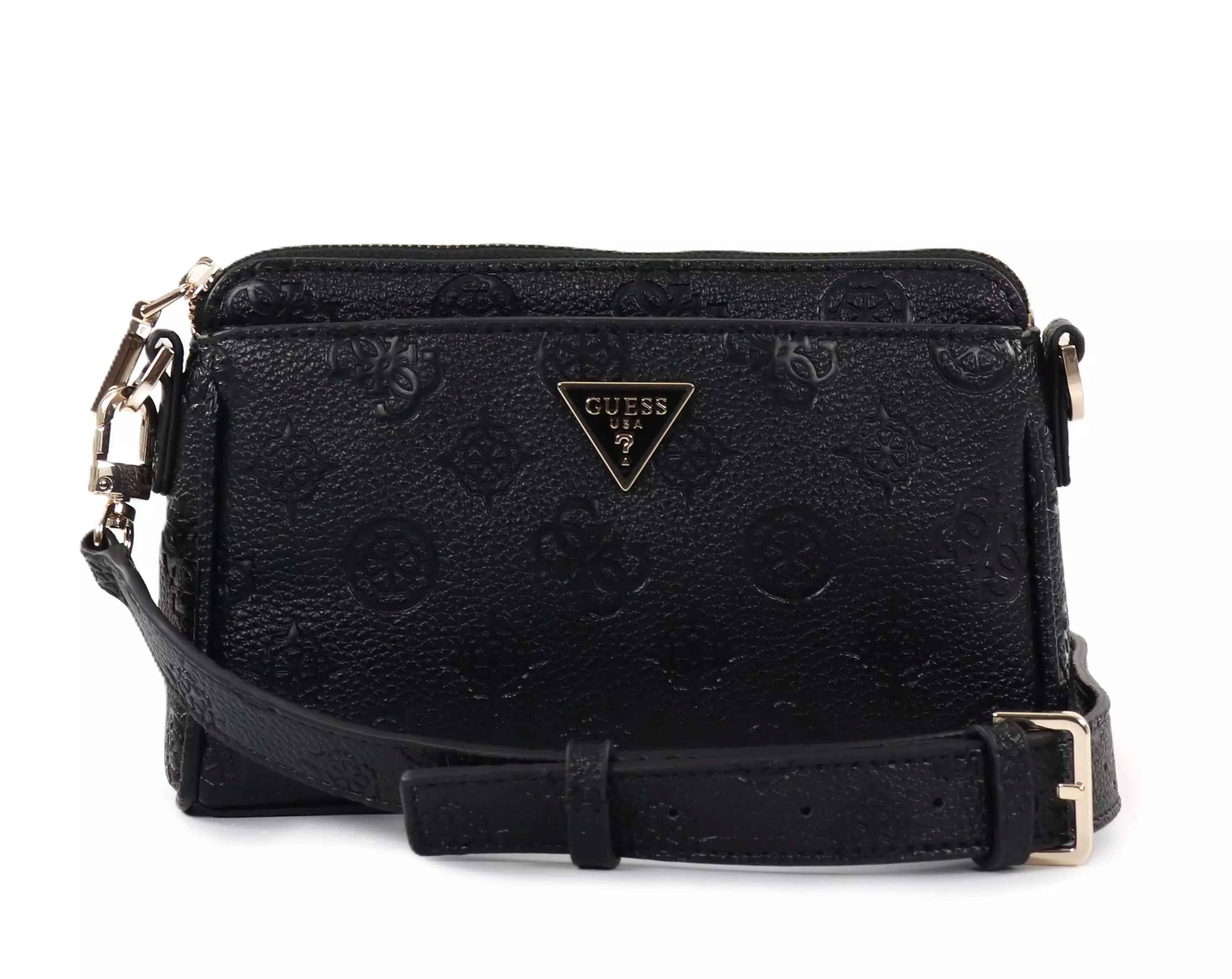 En snygg Guess axelväska med ett vackert präglat mönster och slående gulddetaljer. Ett kompakt men praktiskt val för vardag och fest.