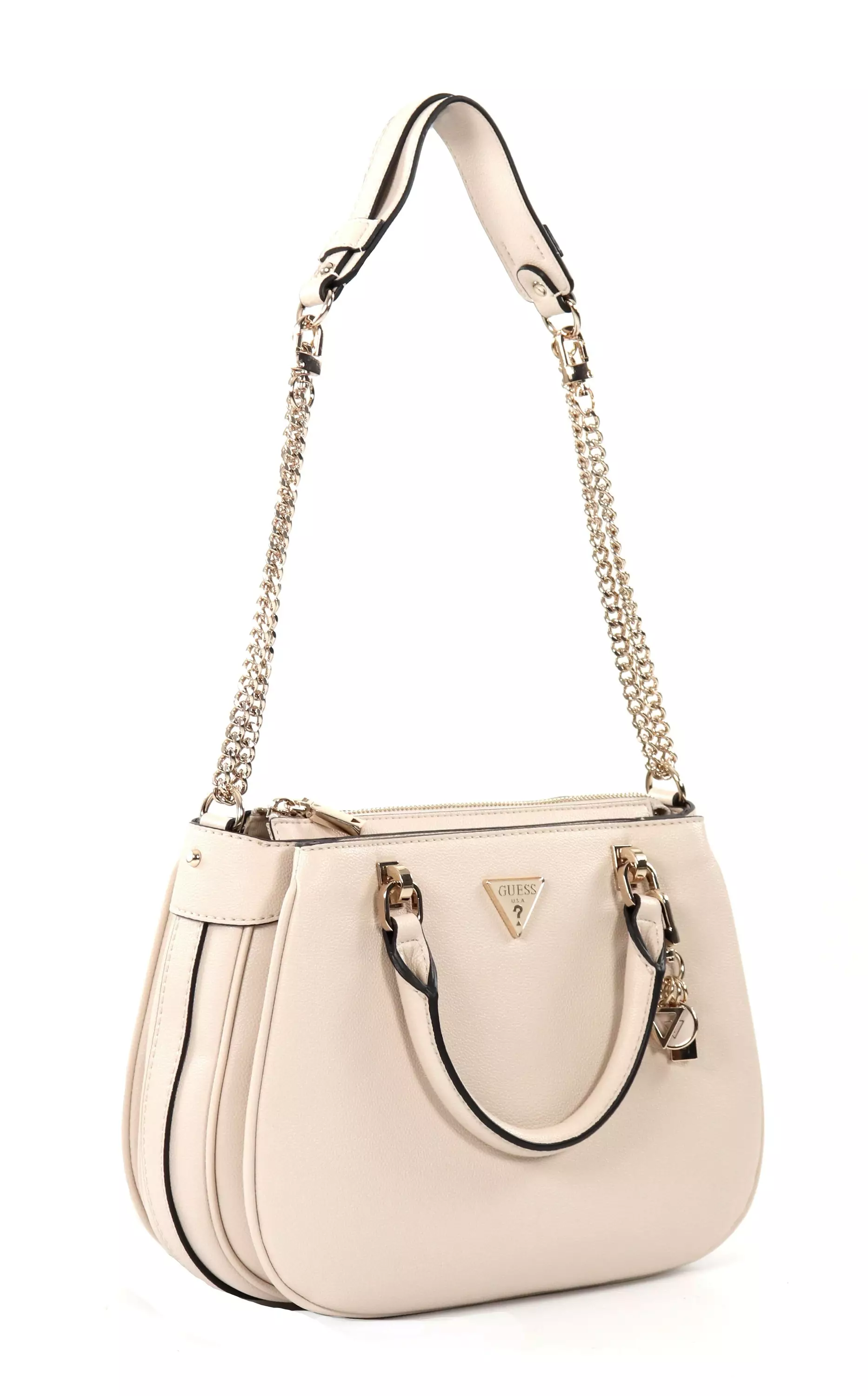 En feminin och mångsidig Guess-axelväska kombinerar stil och praktisk. Den avtagbara Guess-dekorationen och gulddetaljerna gör den här väskan till det perfekta komplementet till vilken outfit som helst!