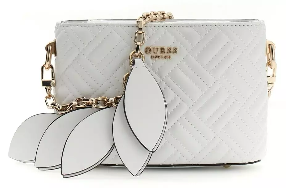 Guess lilla väska är full av vackra detaljer! Det sydda materialet och kedjeremmets vackra fjädermönster kompletterar stilen.