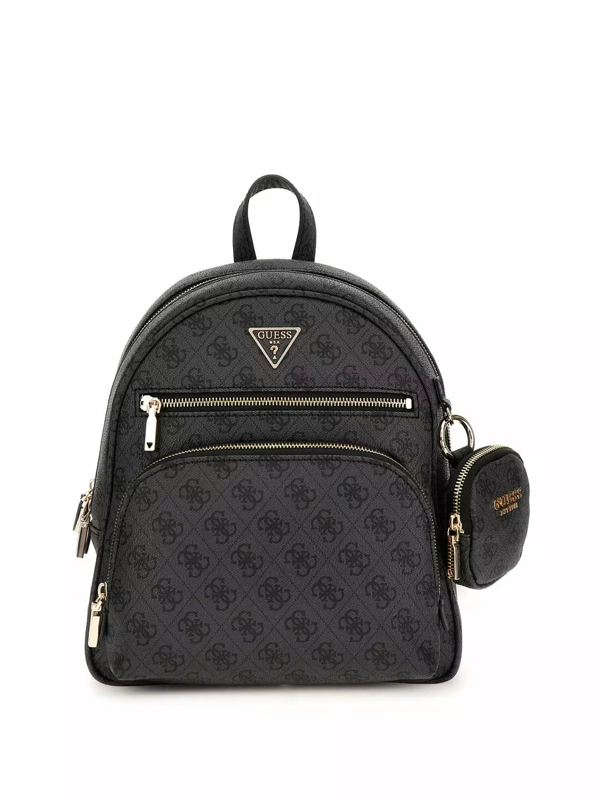 Guess logotypmönstrad ryggsäck med flera olika fickor och en avtagbar handväska.