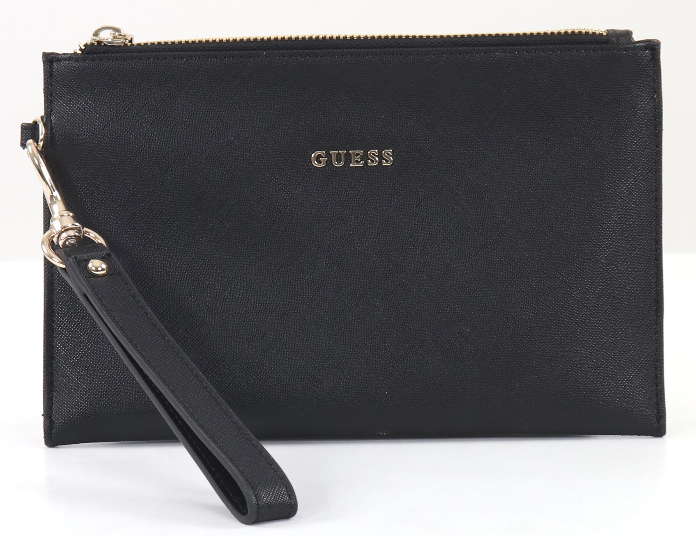 Tunn syntetväska från Guess med avtagbar handledsrem.
