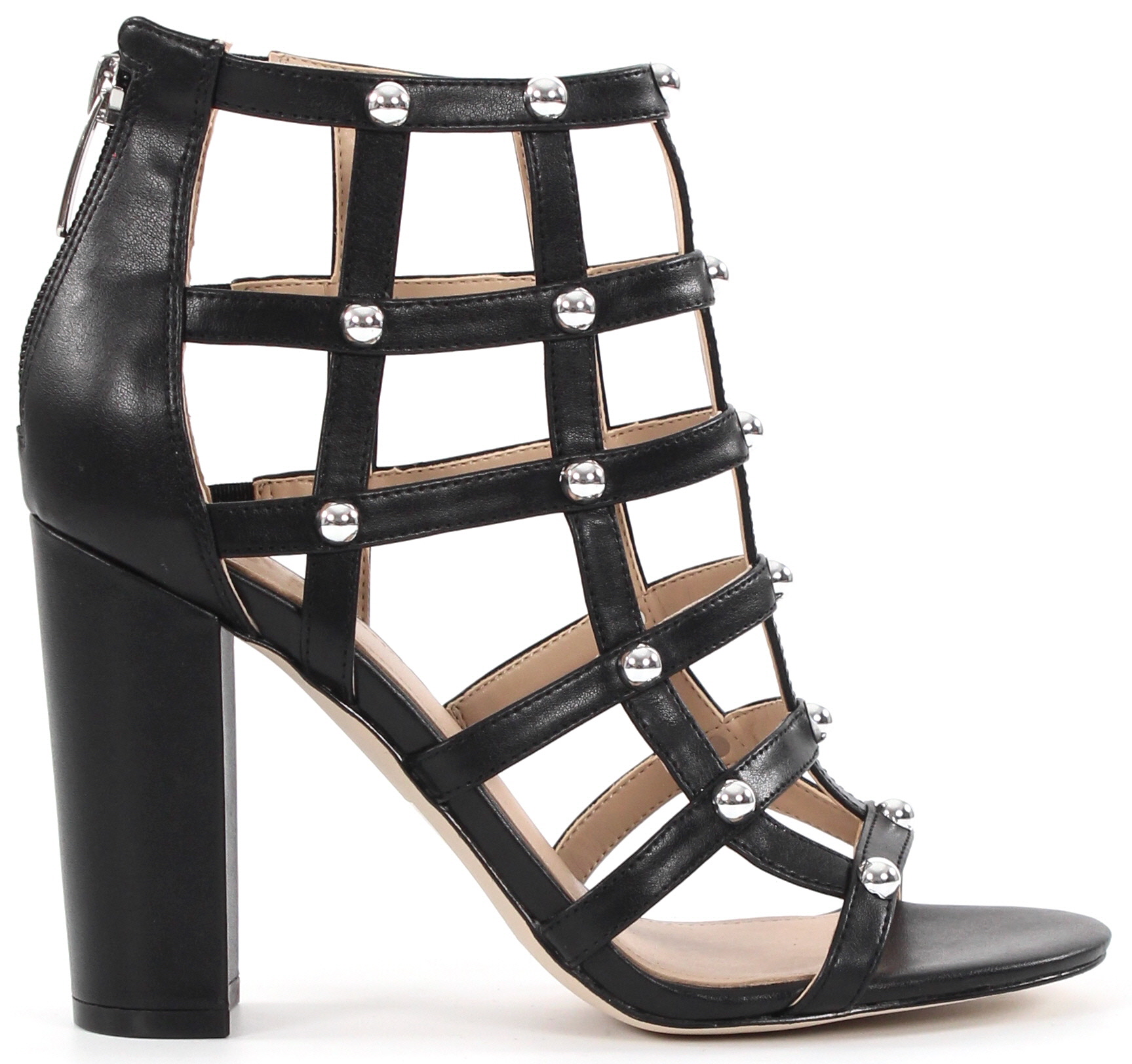 Högklackade skor med stolpklack och nitdekorationer.