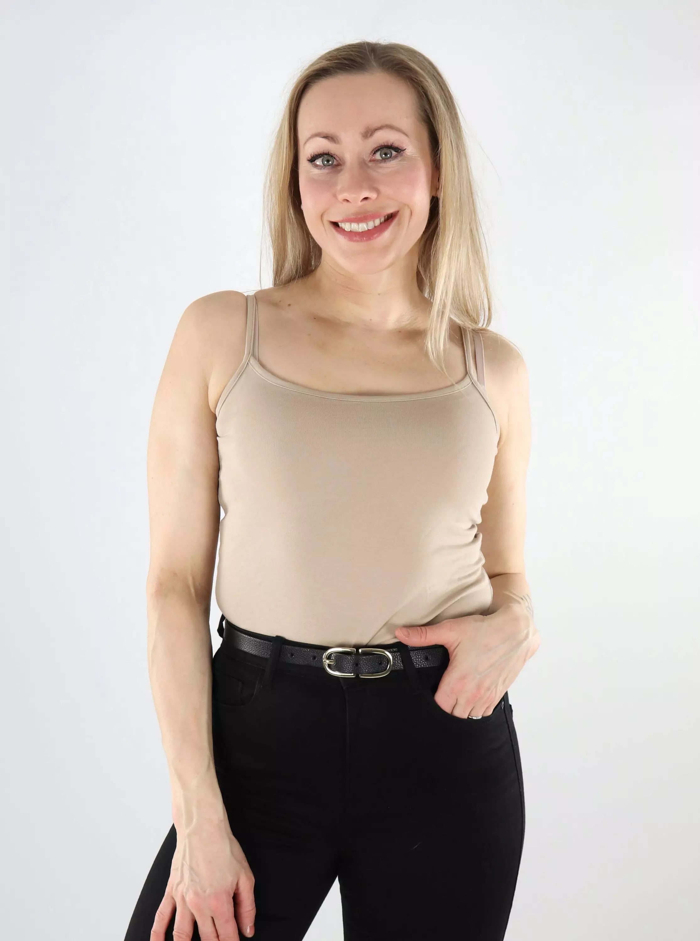 En riktigt mjuk bomullstopp med justerbara remmar och stretchigt material för bra passform.