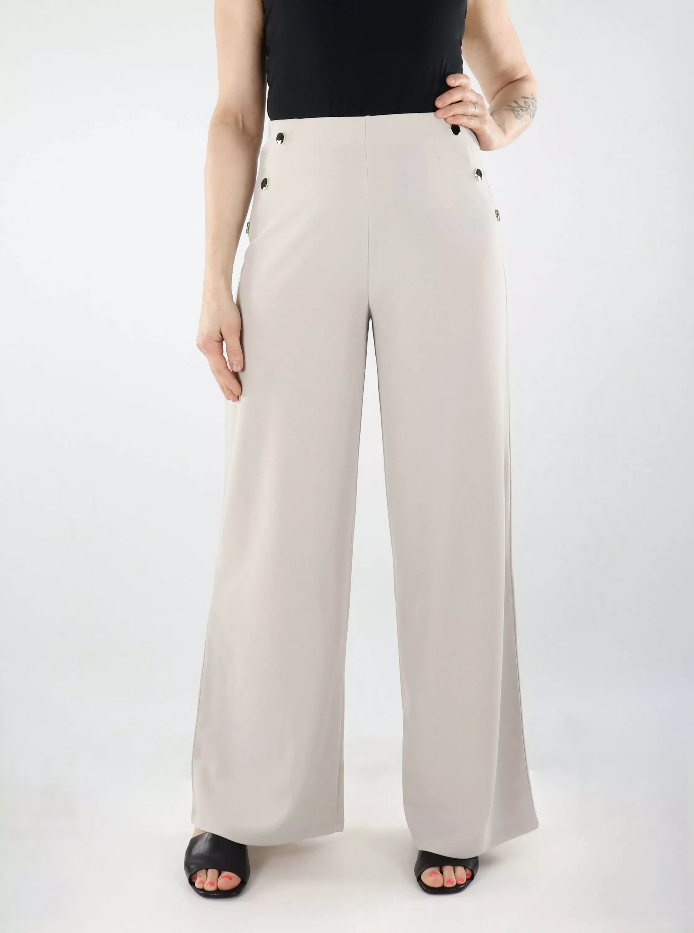 Trendiga byxor med vida ben och snygga knappdetaljer. Resår i midjan garanterar perfekt passform!