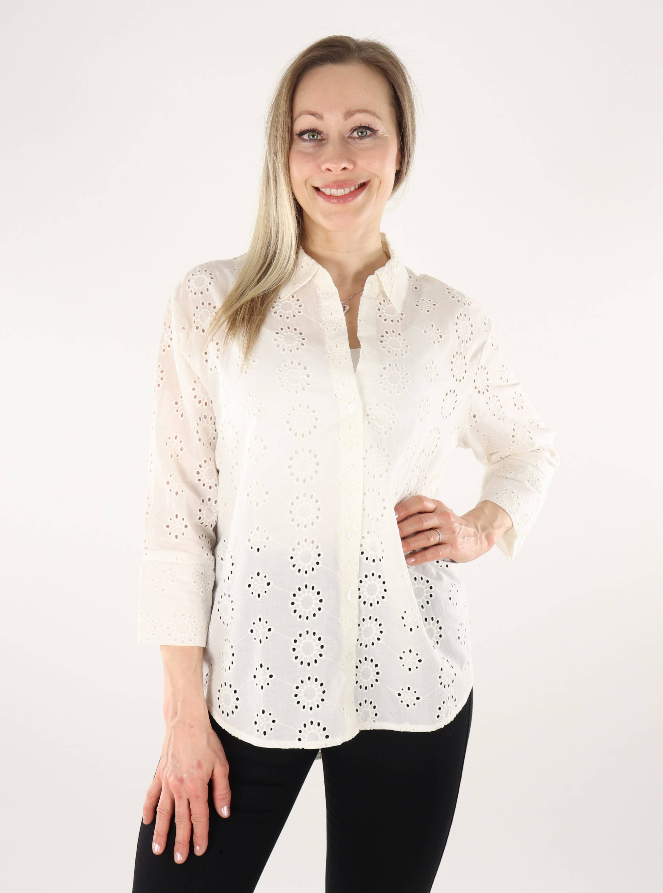 Avslappnad modellskjorta med vackra spetsbroderier. Längre modell, rundad fåll.