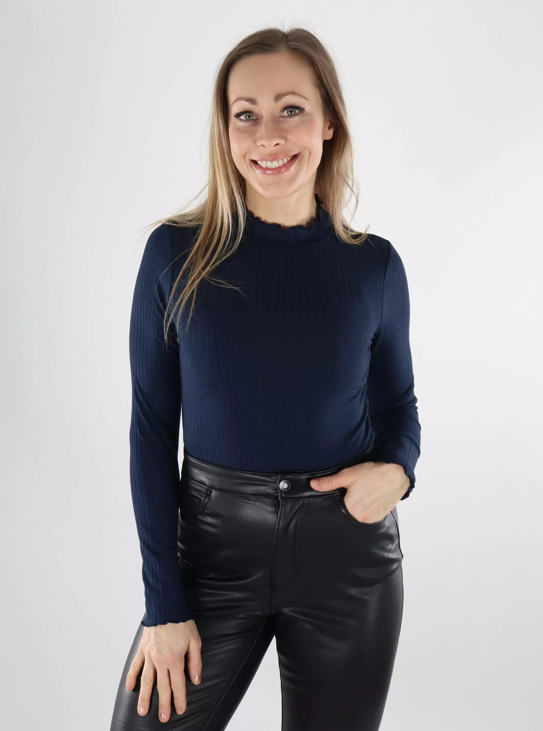 En ribbad skjorta med hög halsringning och volangkanter som ger looken ett lätt uttryck. Det bekväma materialet gör den till en vardagsfavorit!