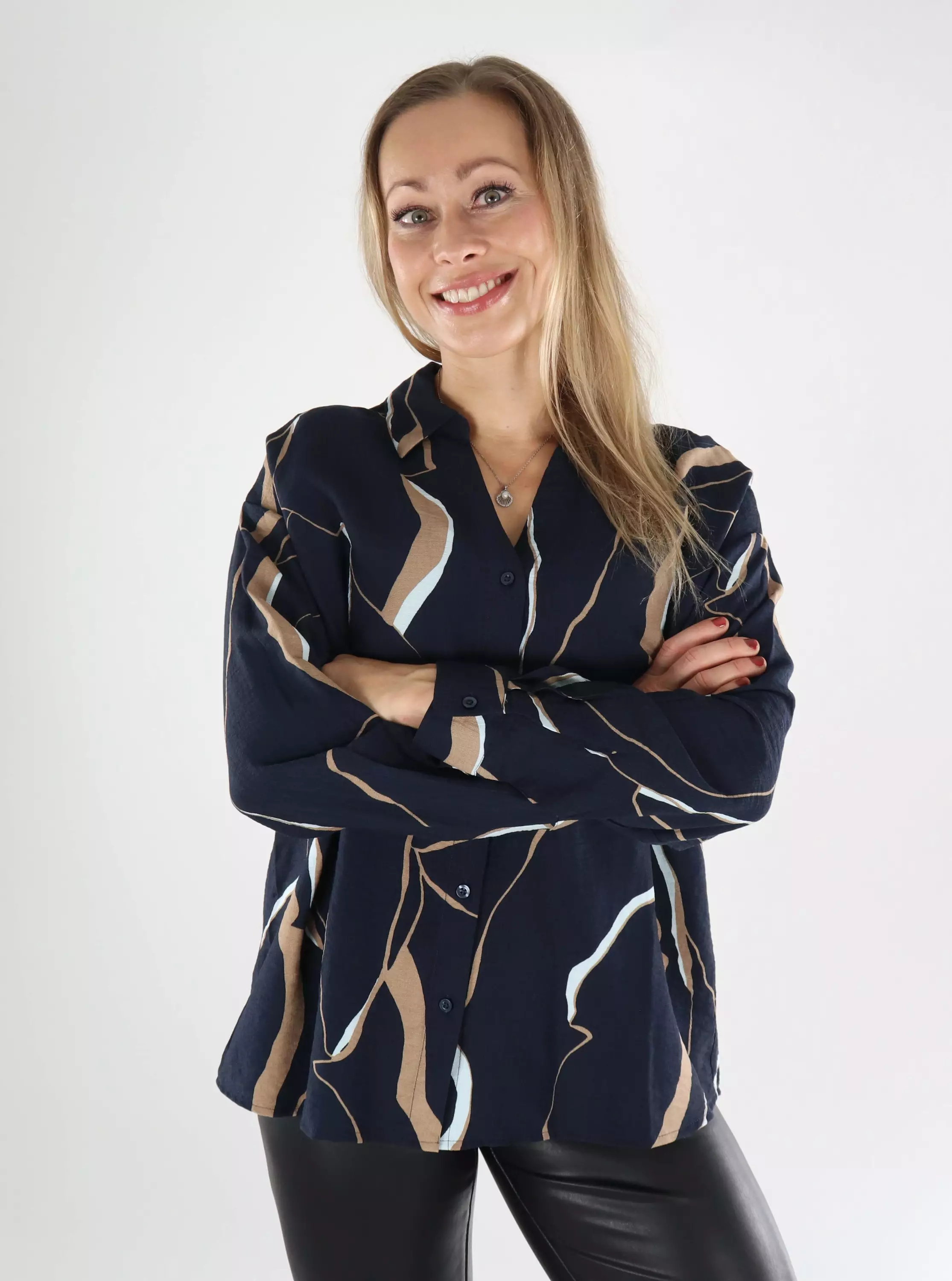 Denna JDY-skjorta kombinerar ett vackert mönster med en avslappnad, elegant skärning. Den rundade fållen, längre baktill, skapar en modern silhuett.