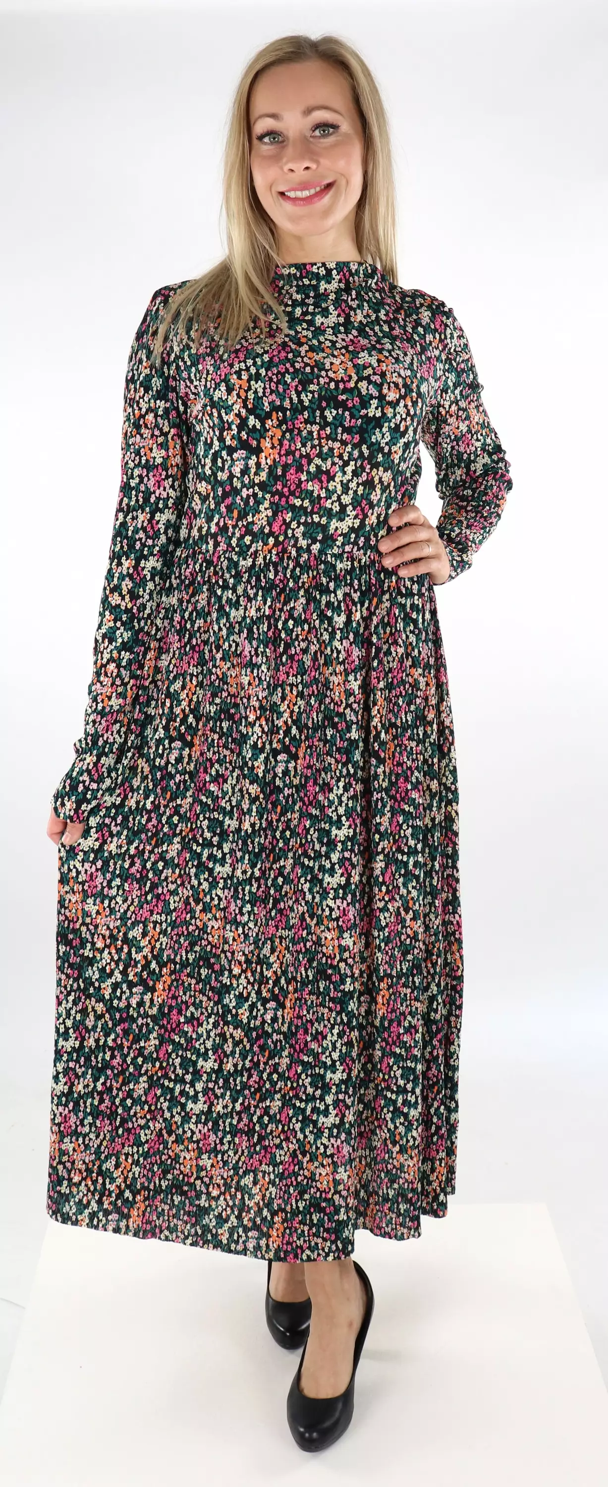 Vacker blommig klänning i crepetyg, stretchigt material.