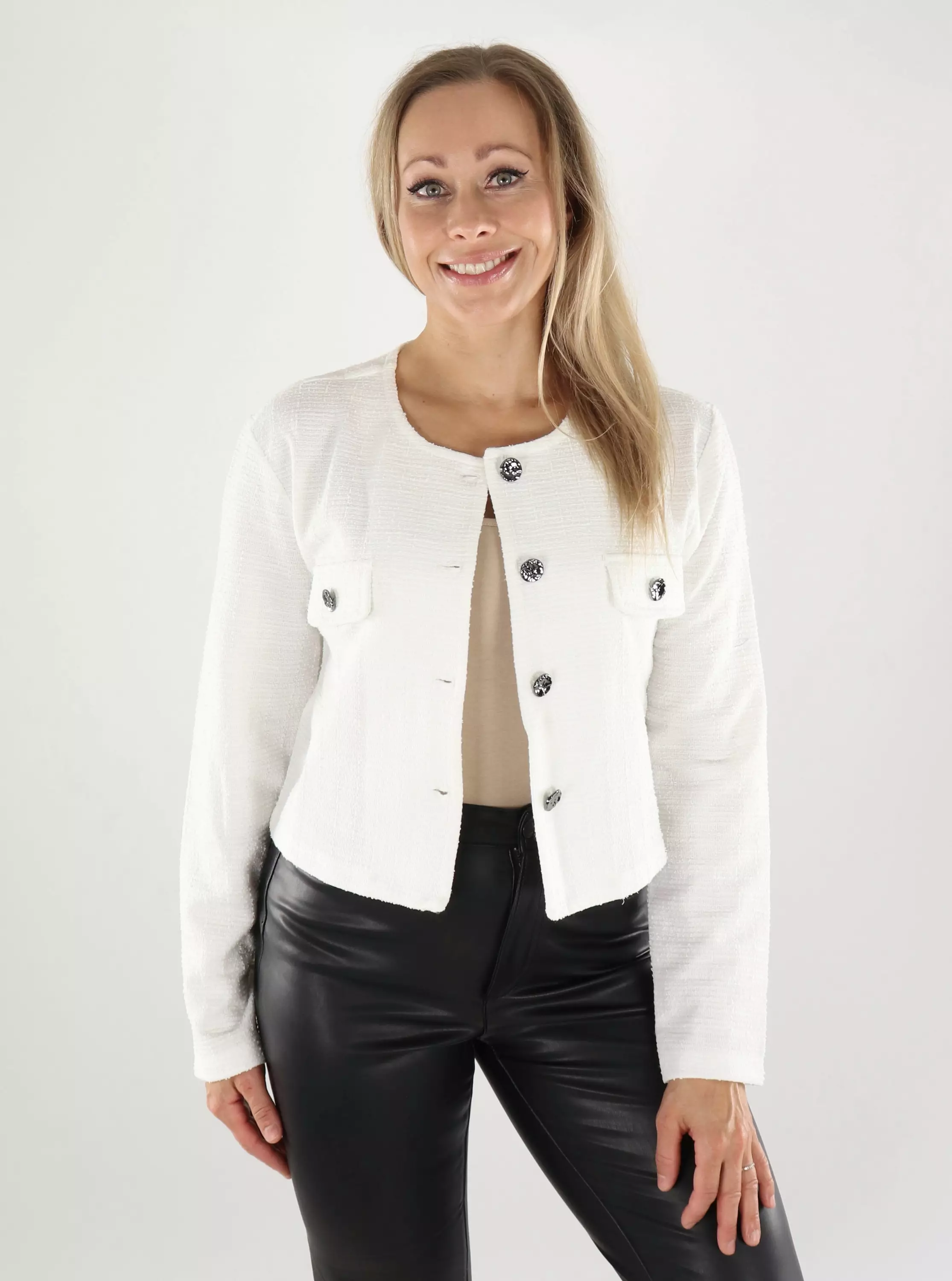 JDYs korta kavaj är ett mångsidigt val som passar både till vardags och mer formella tillfällen. Den snygga skärningen, boucléfinishen och de mörkgrå knapparna ger outfiten en färdig look.