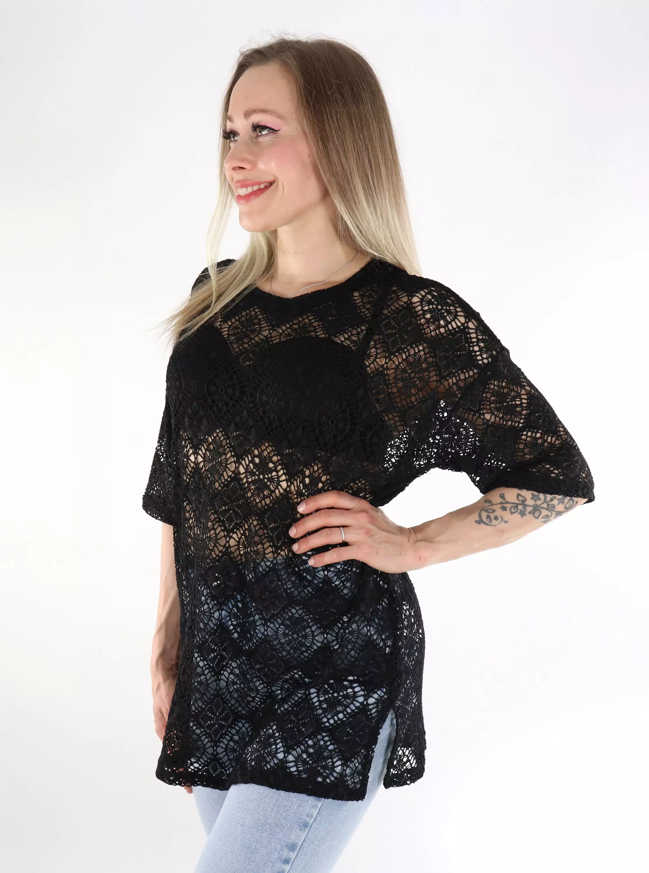 Lång t-shirt av elastisk spets med slitsar i sidorna.