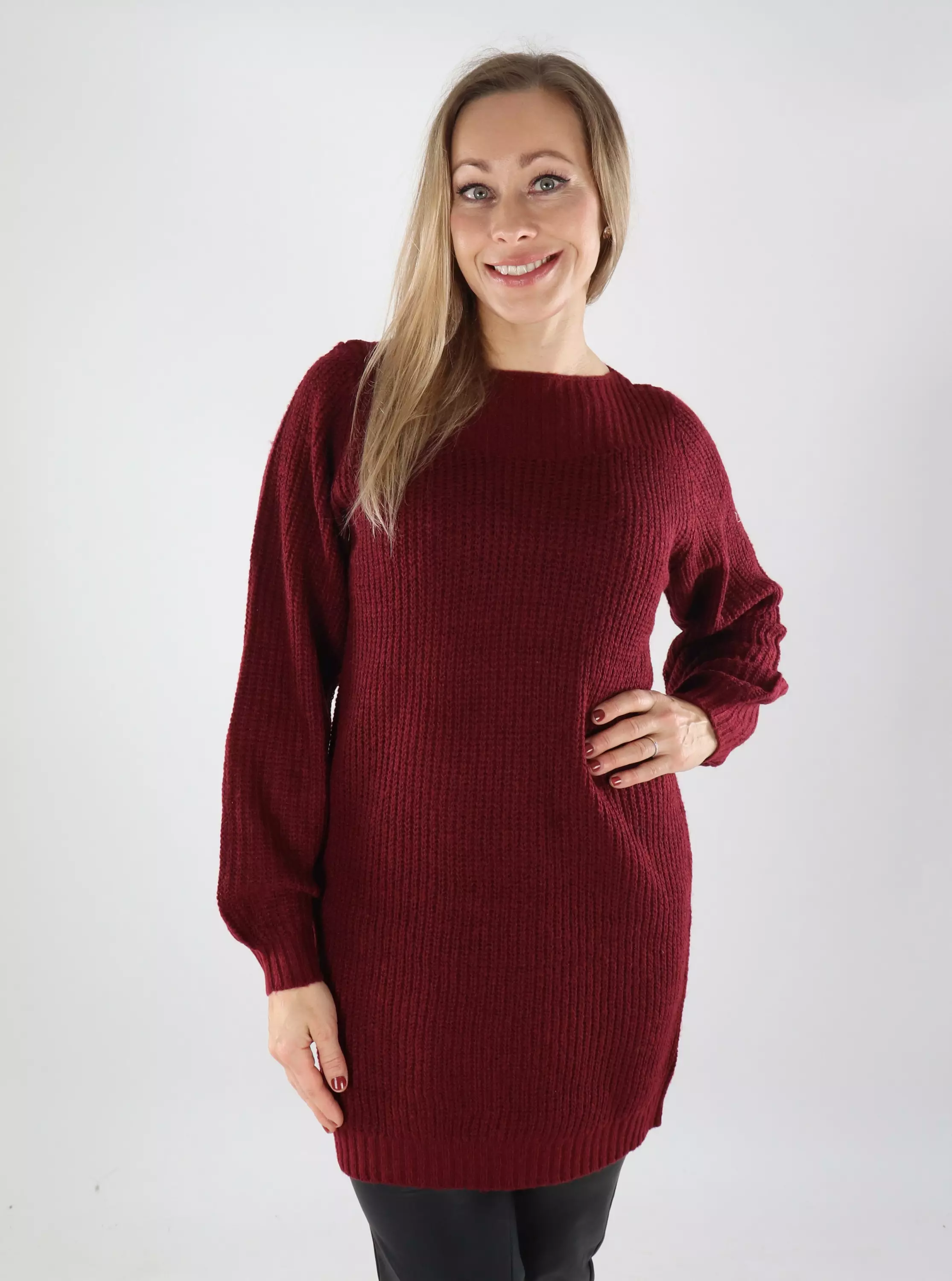 Vacker stickad klänning med båthalsringning och avslappnade ärmar.