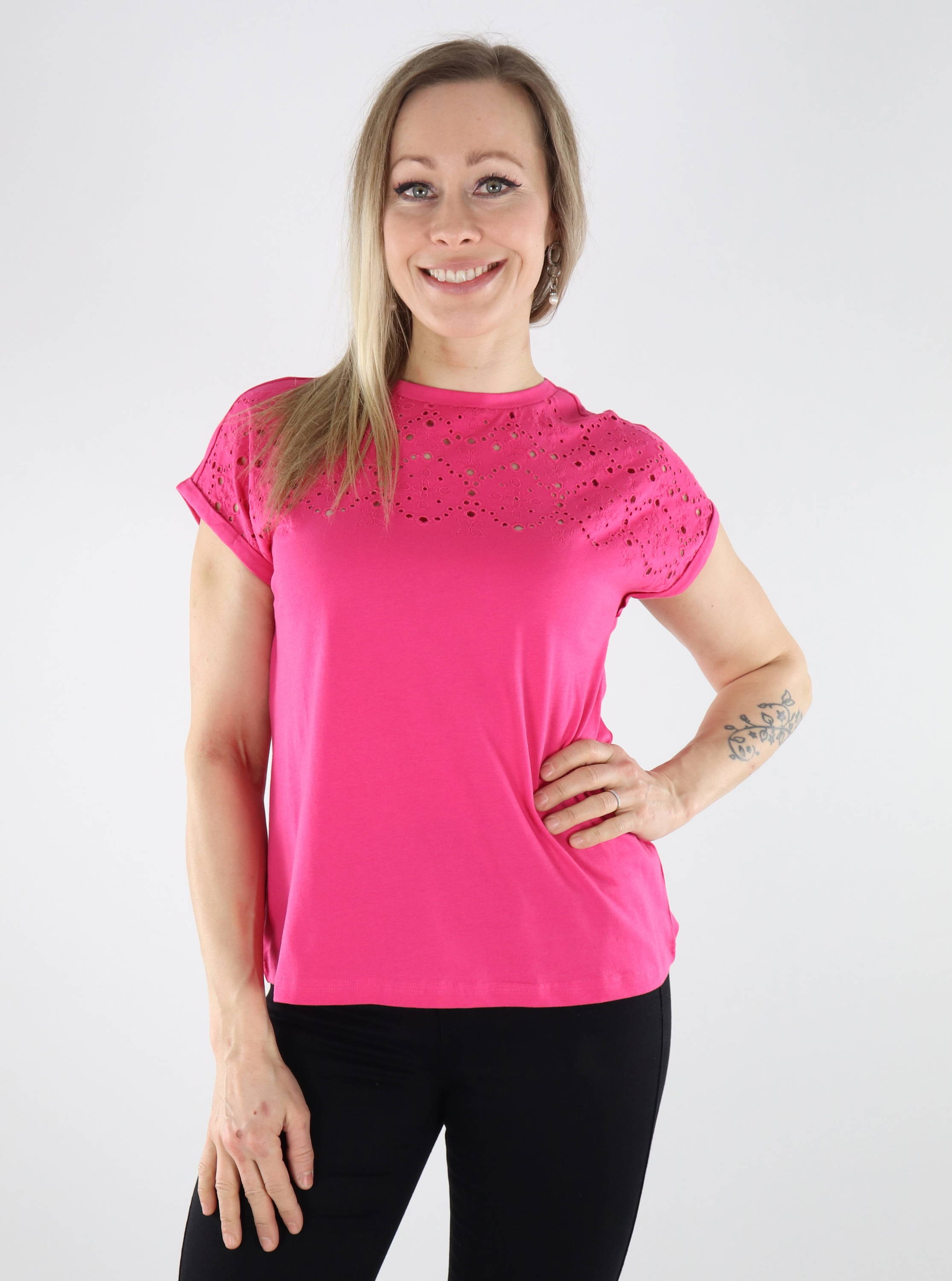 T-shirt i mjuk ekologisk bomull med spetsmönstrad topp.
