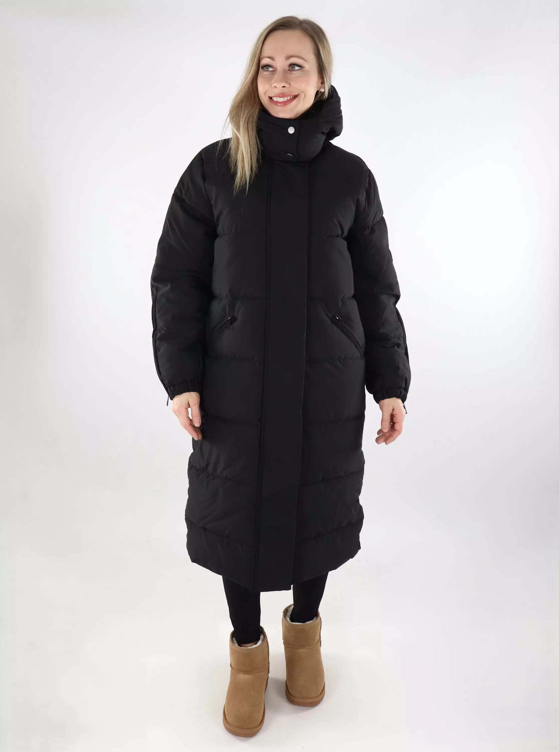 Lång och varm vadderad jacka med dragkedjor på ärmarna och tvåvägsdragkedja.
