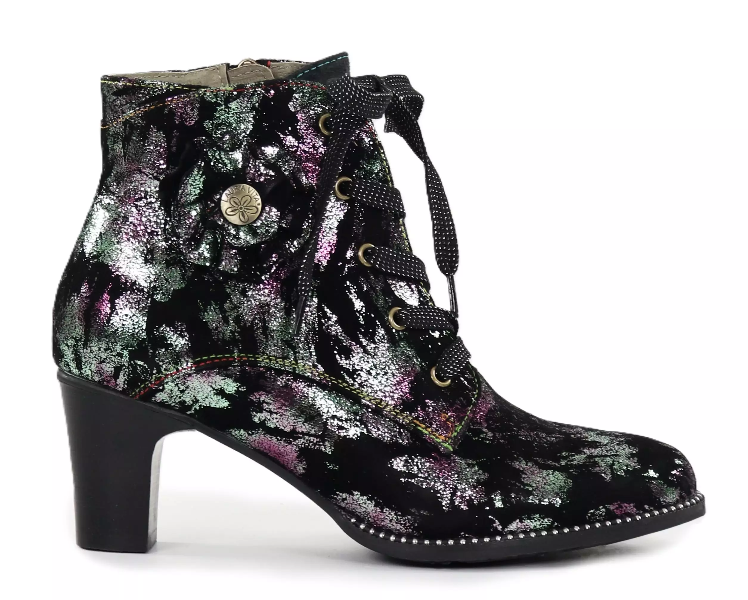 Snygga stövletter med skimrande mönster och vackra dekorsömmar. De robusta platåklackarna ger hållning och komfort, medan Laura Vitas personliga stil säkerställer att du sticker ut med stil!