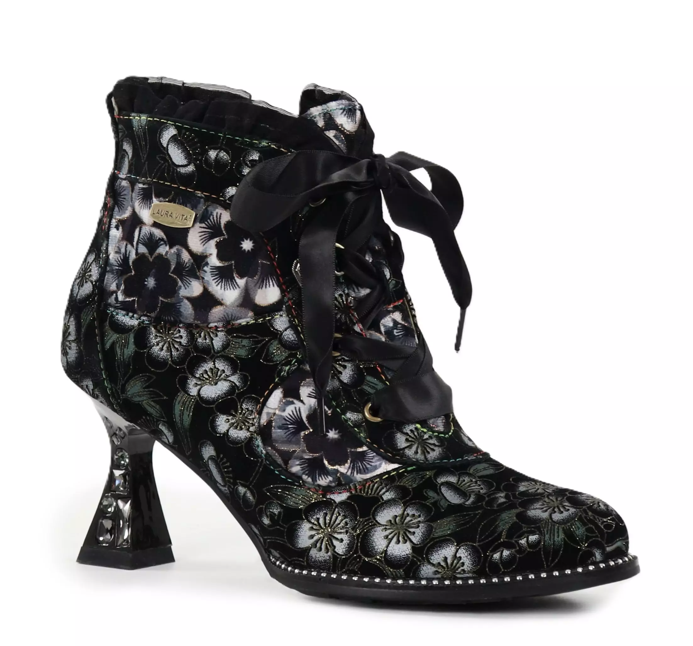 Dessa charmiga Laura Vita stövletter kombinerar ett slående blommönster, satinband och en fantastisk diamantutsmyckad klack - det perfekta valet när du vill ge din outfit en touch av lyx. Sidodragkedjan gör dem enkla att ta på, och de högkvalitativa detaljerna kompletterar den unika och feminina stilen.