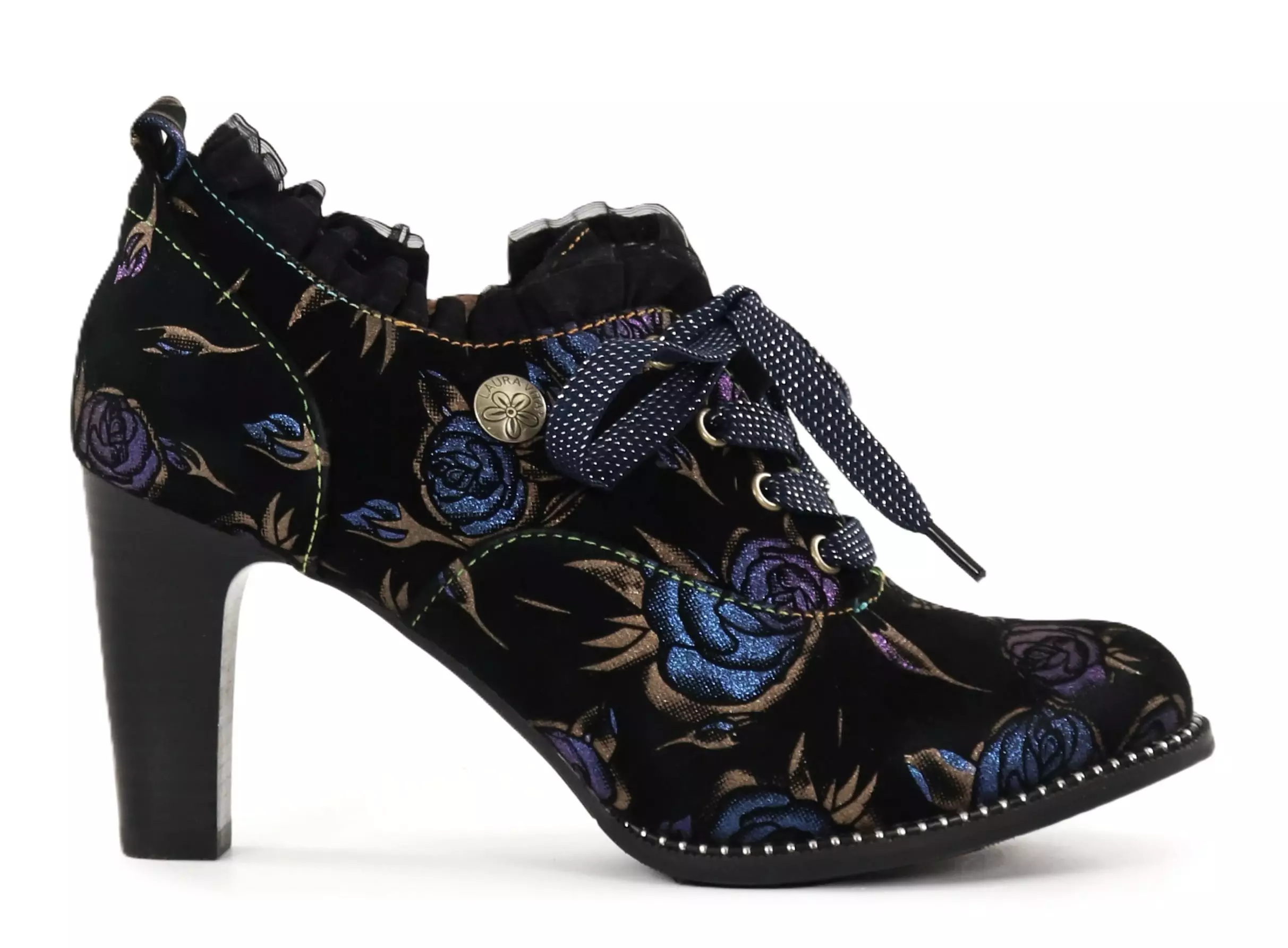Dessa charmiga Laura Vita promenadskor kombinerar ett vackert rosenmönster, färgglada sömmar och en feminin volangkant. Den högklackade modellen ger balans åt dina steg!