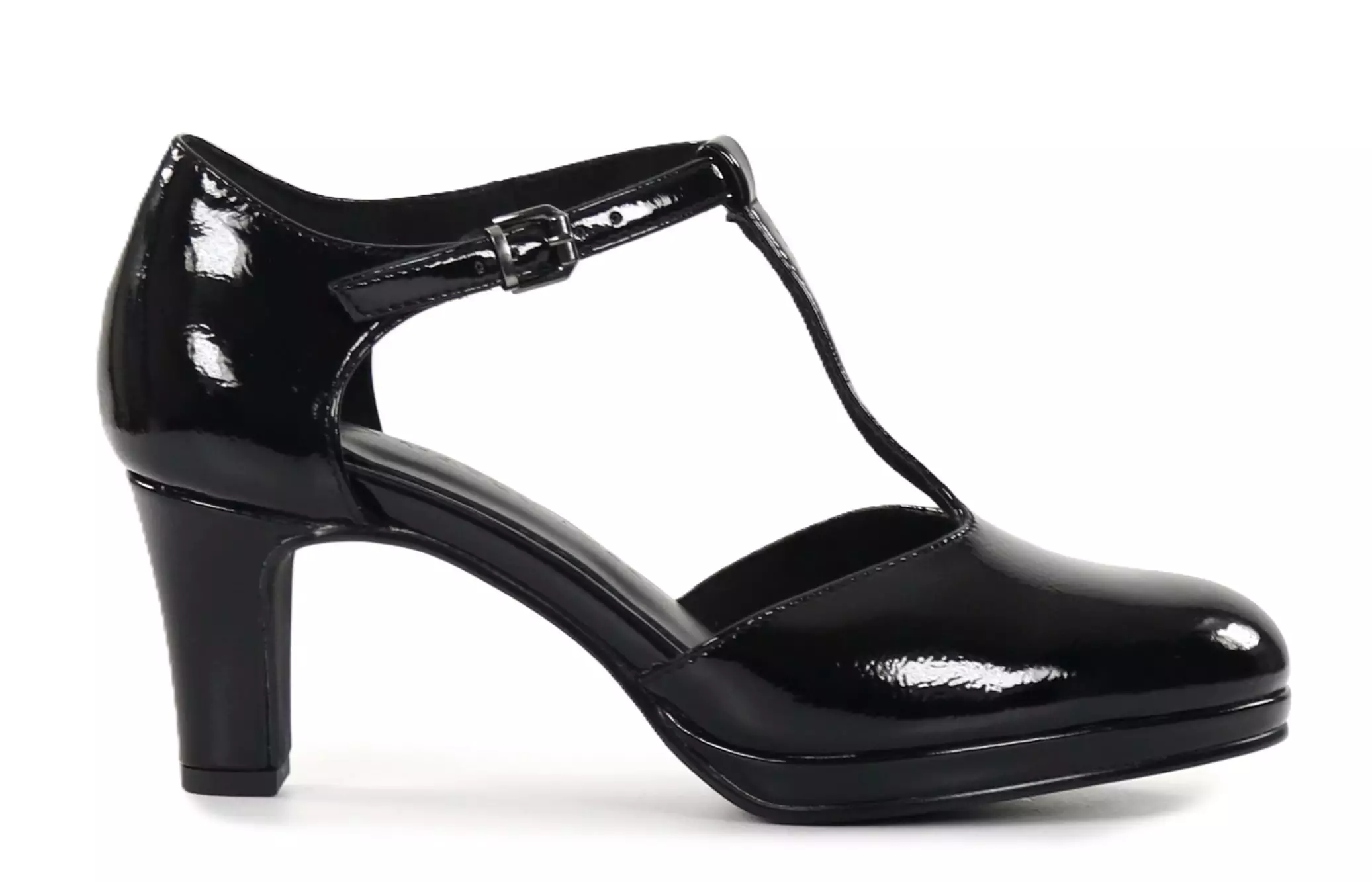 Klassiskt snygga, glänsande högklackade skor med justerbara remmar runt vristen. Tillverkade av 100 % veganska material!