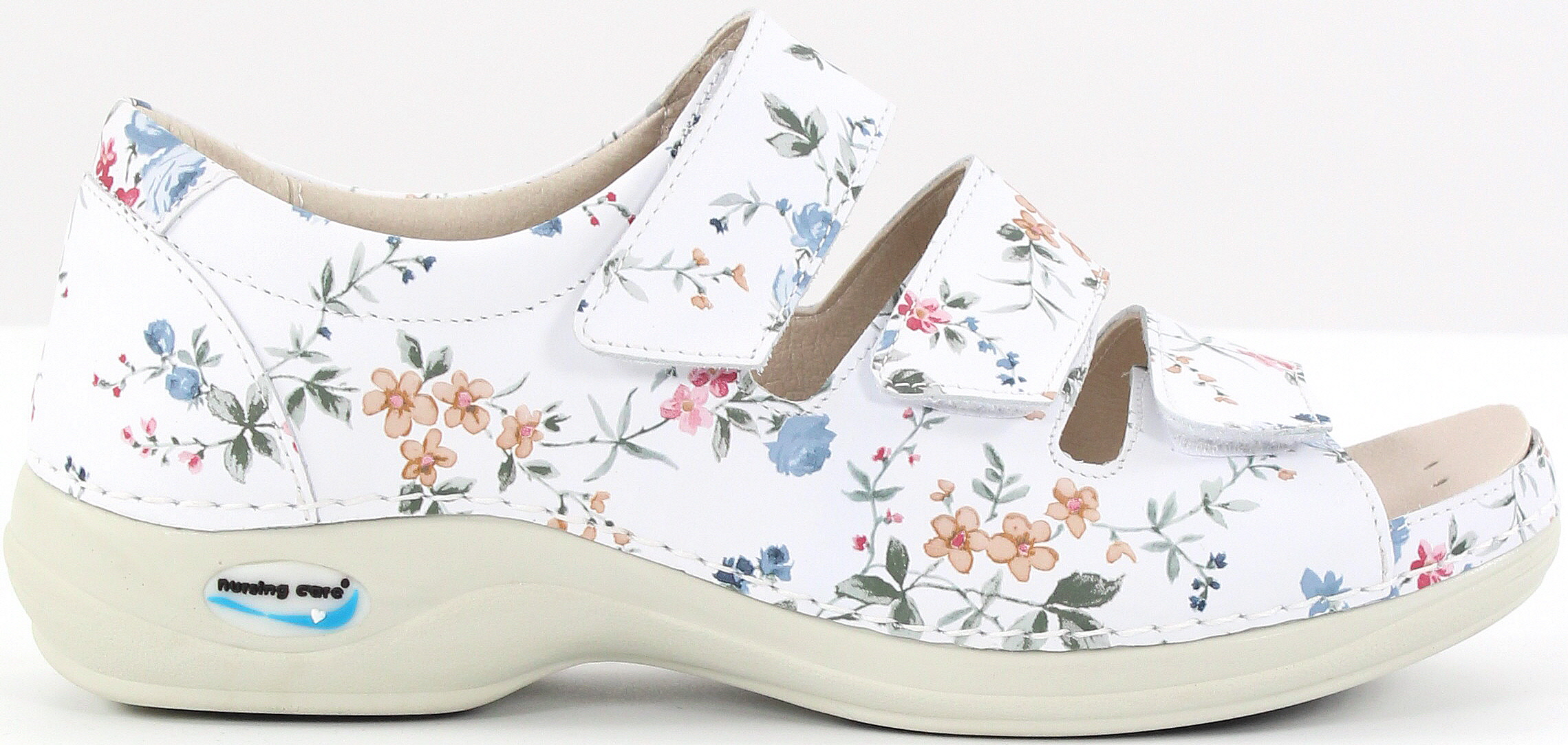Arbetsskorna har tre justerbara kardborreband ovanpå foten. Klackhöjden ca 3 cm