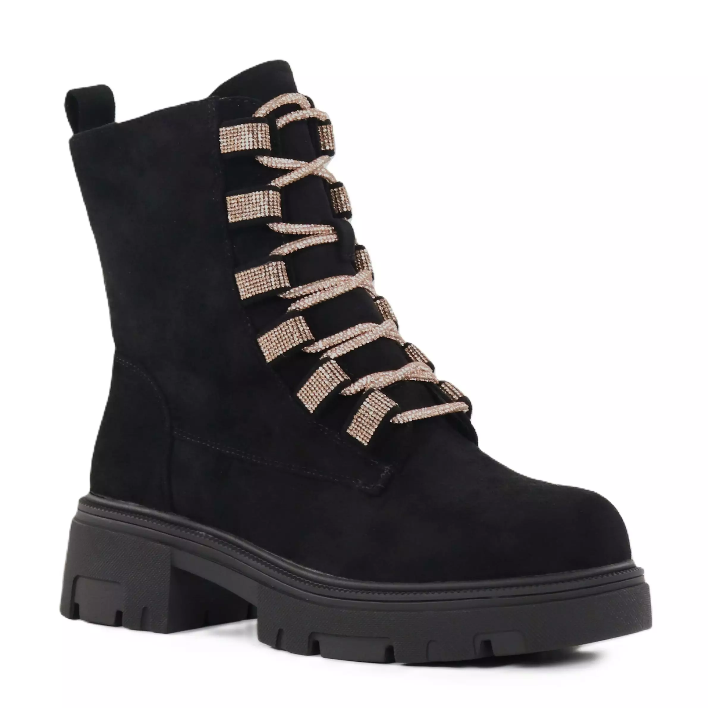 Dessa Migant-stövletter kombinerar en ruffig stridsstövelmodell med feminina roséguldfärgade glittersnören. Ett snyggt val som ger din outfit lite glitter!