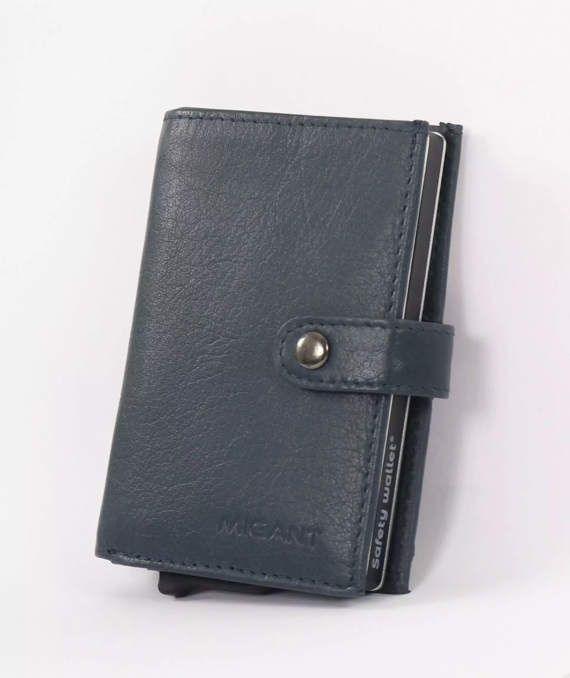 RFID-skyddat läderkortfodral, korten lyfts upp genom att trycka på knappen.