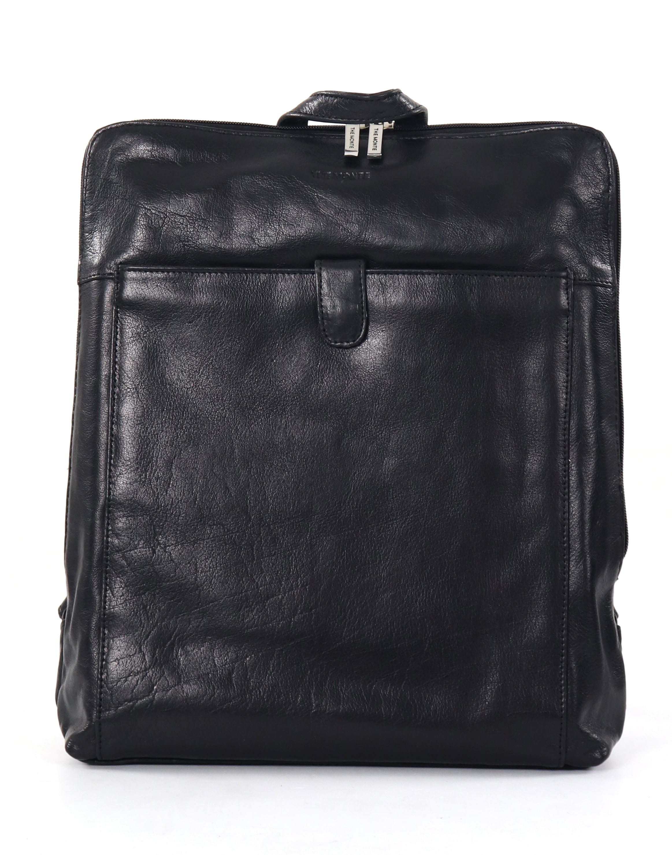 En ryggsäck i äkta läder med flera olika fickor för att hålla ordning på saker.