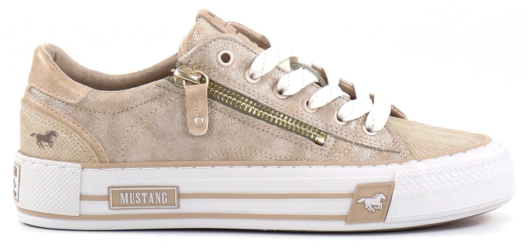 Sneakers med gyllene detaljer. Snörning framtill och dragkedja på insidan.