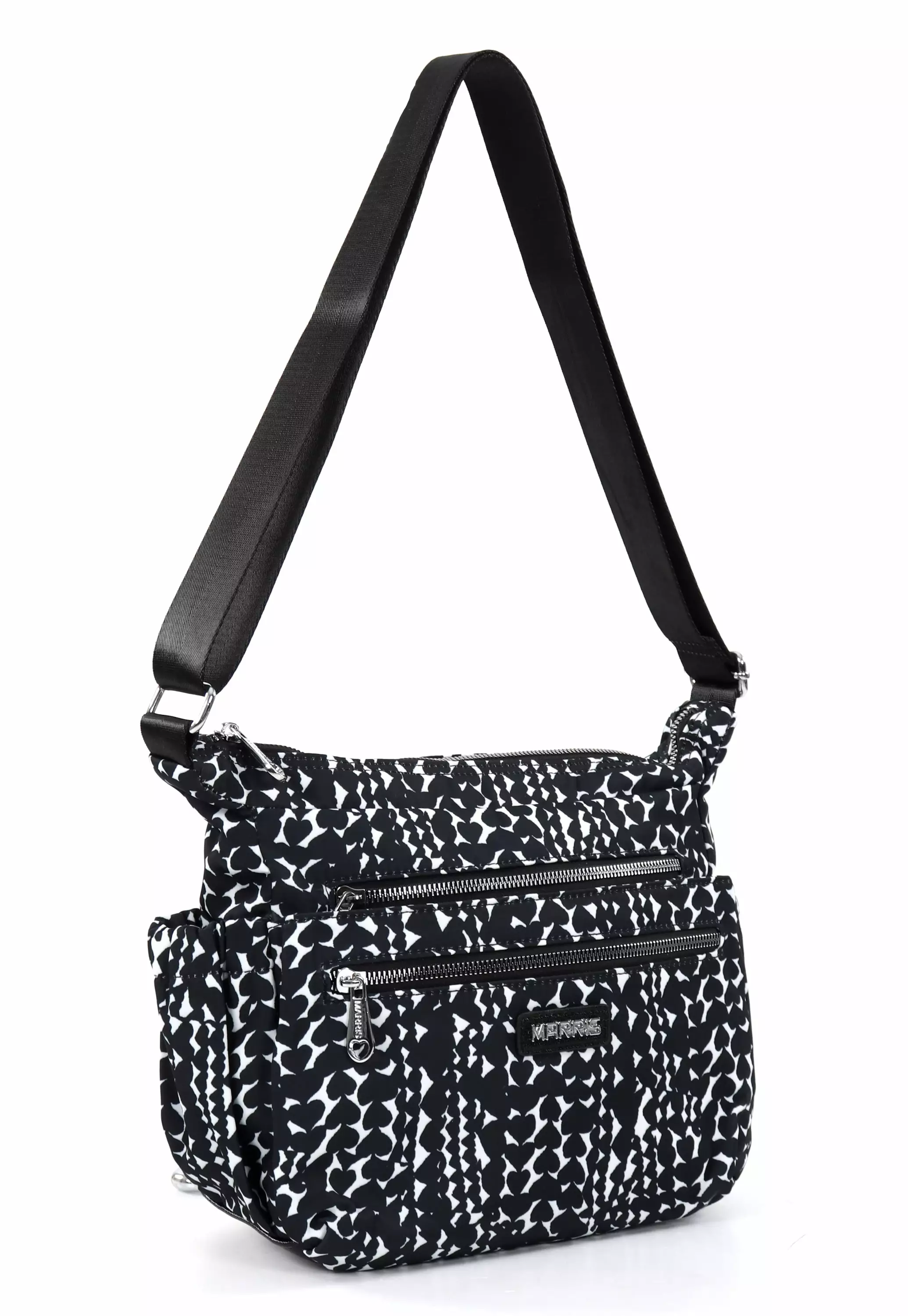 Tygmönstrad väska med dragkedja, flera fickor och justerbar axelrem.