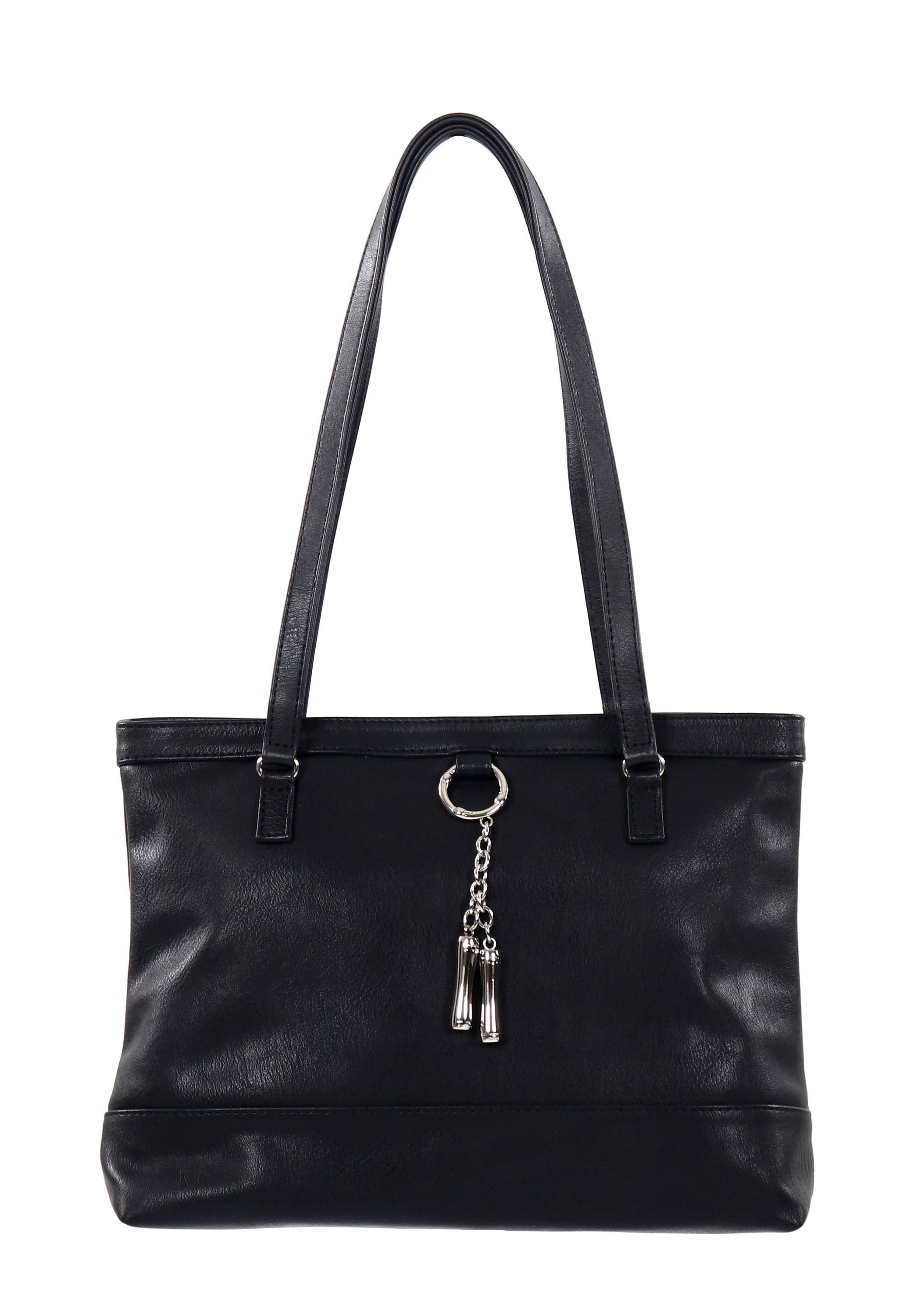 En snygg och rymlig axelväska med en vacker silverfärgad dekoration på framsidan.