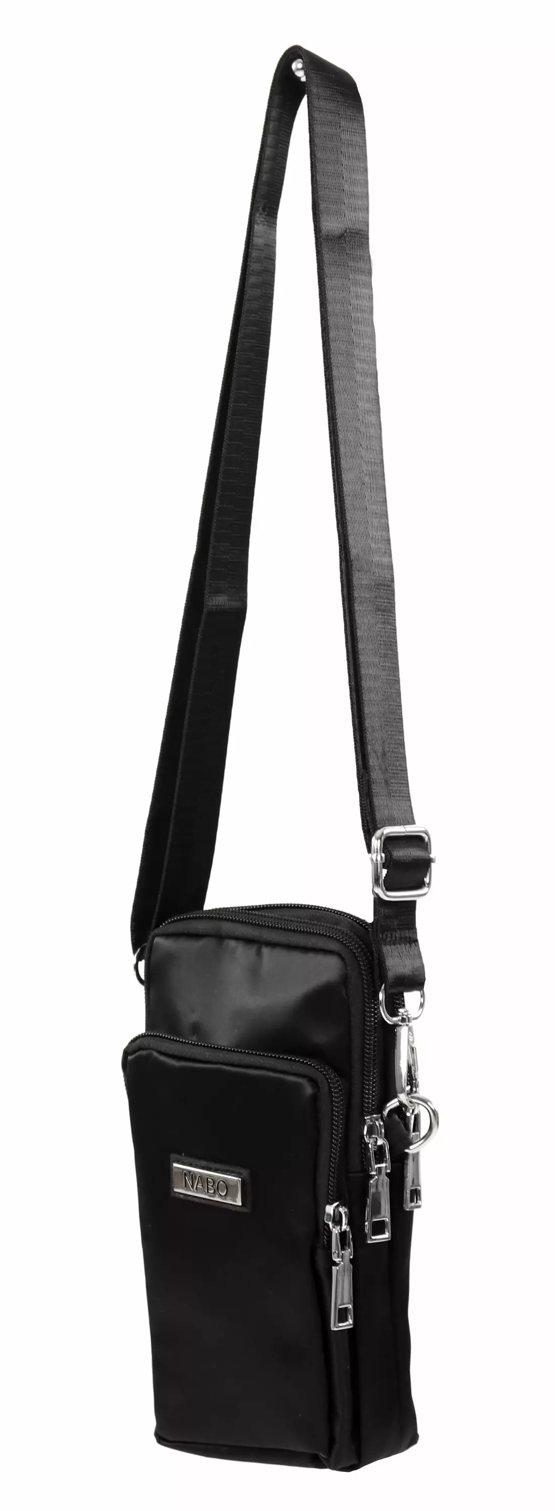 Svart tygtelefonfodral/liten väska med justerbar axelrem.