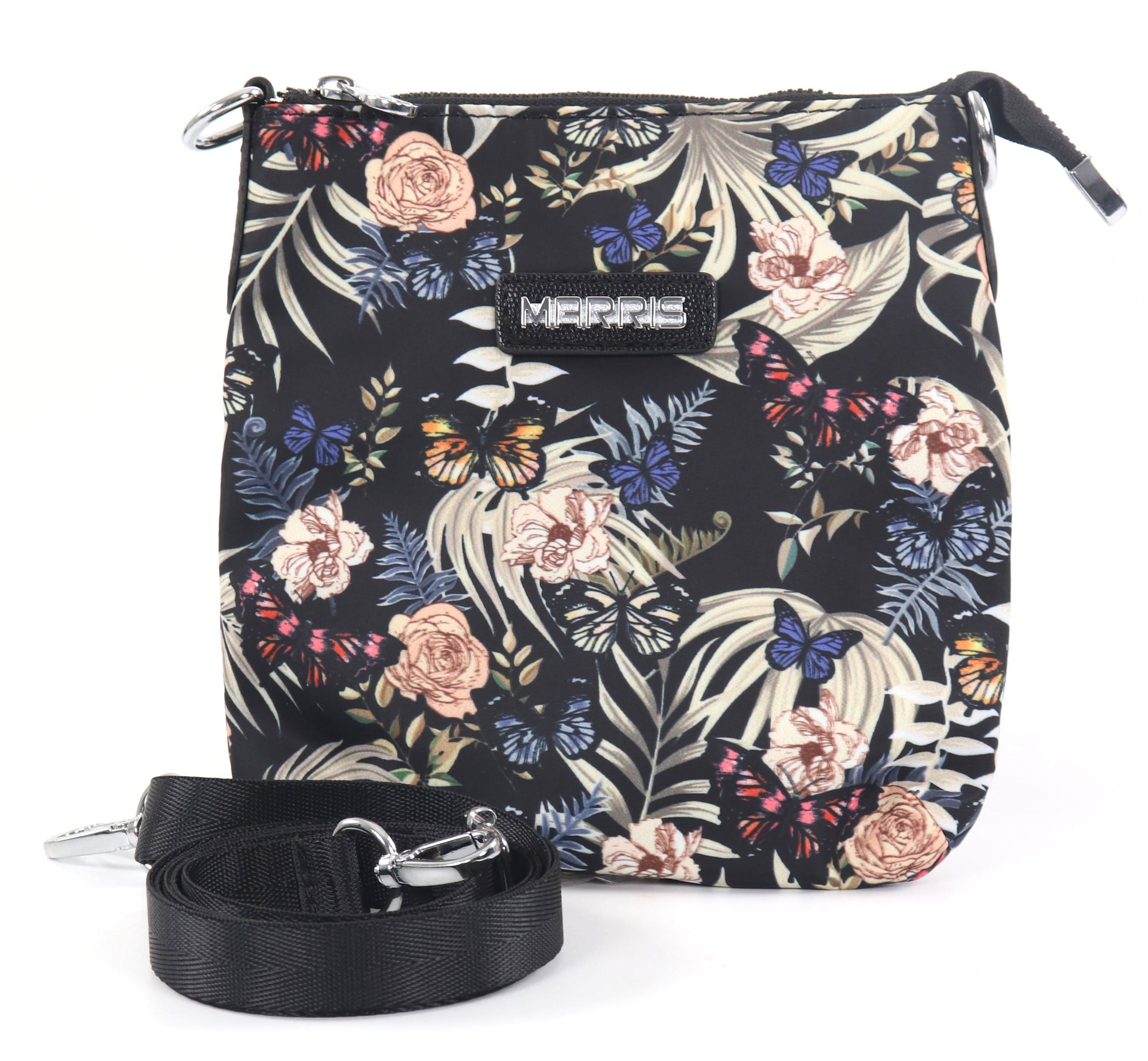 Tyg, blommönstrad liten väska med justerbar axelrem.