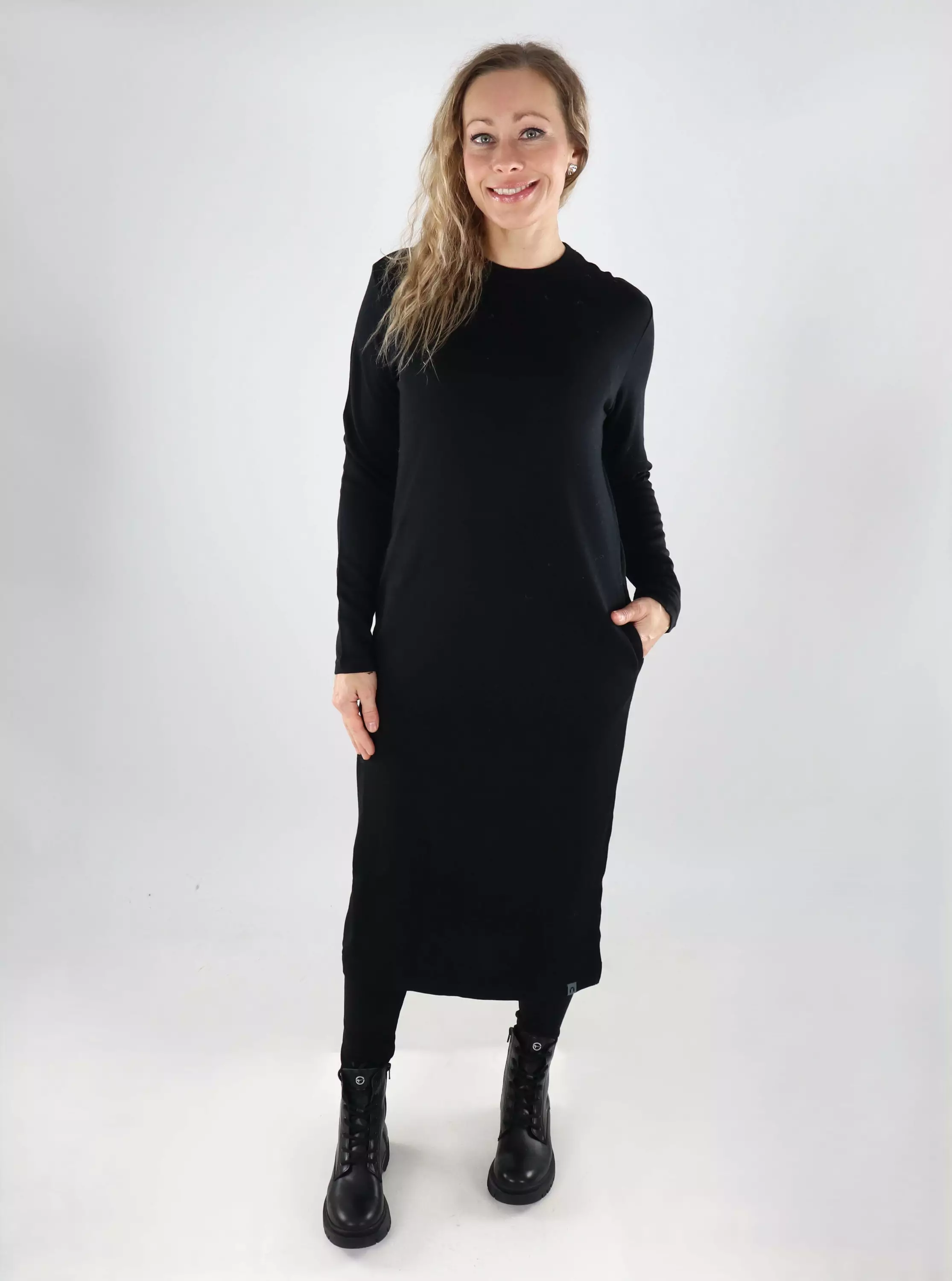 Den mångsidiga klänningen är ett enkelt och snyggt val för vardagsbruk. Den raka, vadlånga modellen med långa ärmar och sidofickor passar både på kontoret och på fritiden. Klänningen har ribbad halsringning och slitsar i sidorna. Den bekväma merino-bambustickningen kombinerar merinoullens andningsförmåga och bambuviskosens mjukhet – den känns bra hela dagen.
