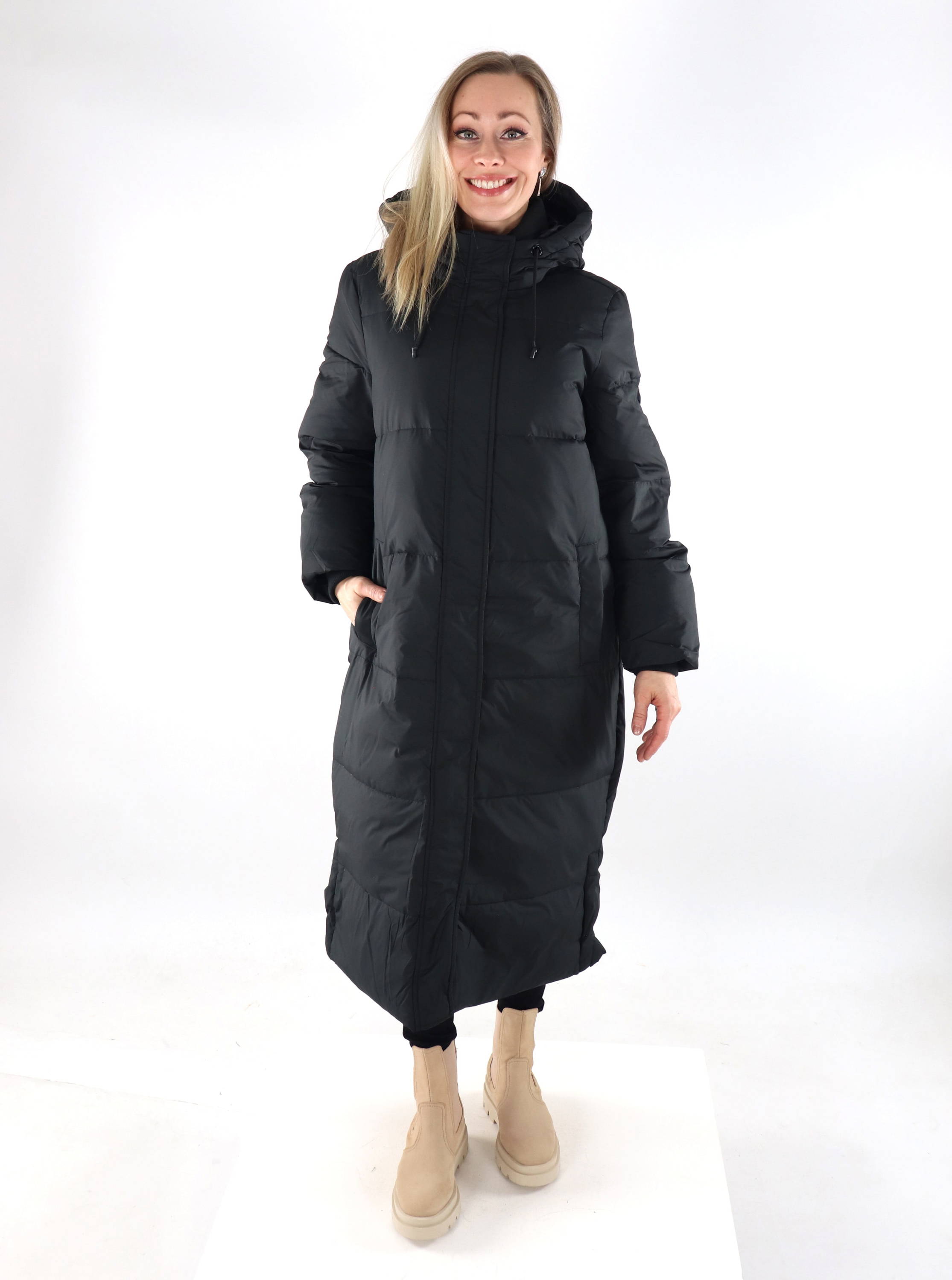 En lång vinterkappa med mer ansvarsfullt producerad, lätt och varm dun- och fjäderstoppning.
