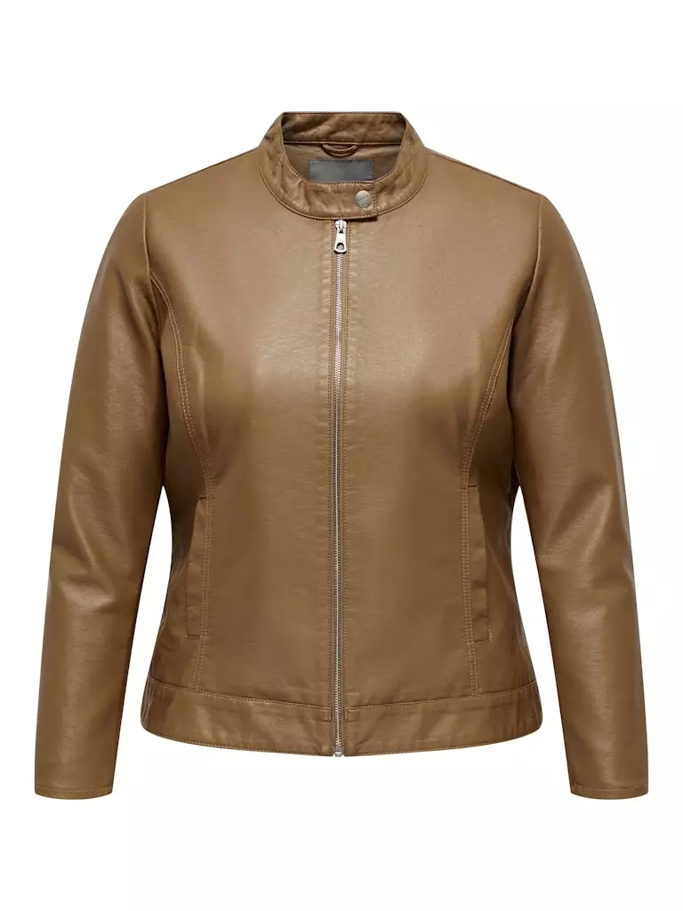 En snygg plus size konstläderjacka ger en elegant look till din outfit i en cognacsbrun nyans. Framfickorna och dragkedjan kompletterar den mångsidiga modellen, som passar perfekt till både jeans och klänningar.