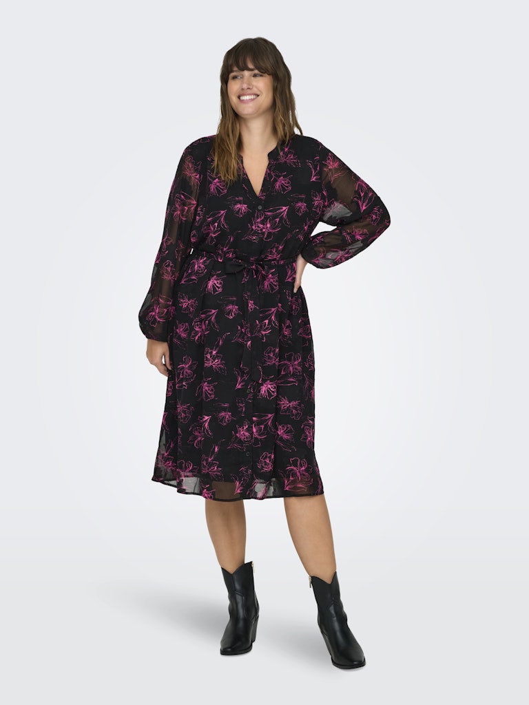 Plus size blommig klänning gjord av lätt material. Knäppning fram och avtagbar dragsko i midjan.