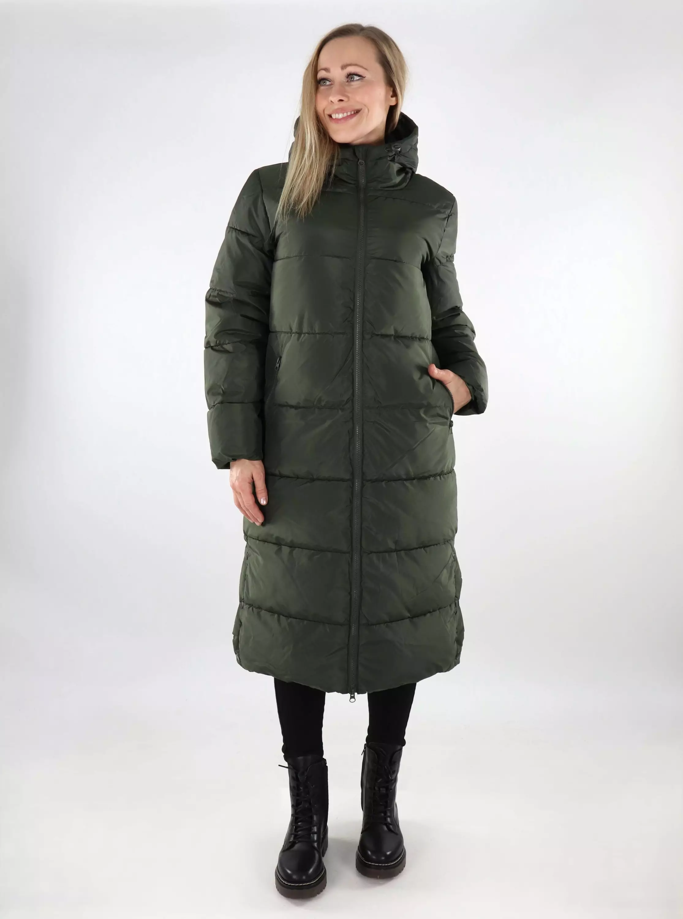 Lång och varm vadderad jacka med slitsar och tvåvägsdragkedja.