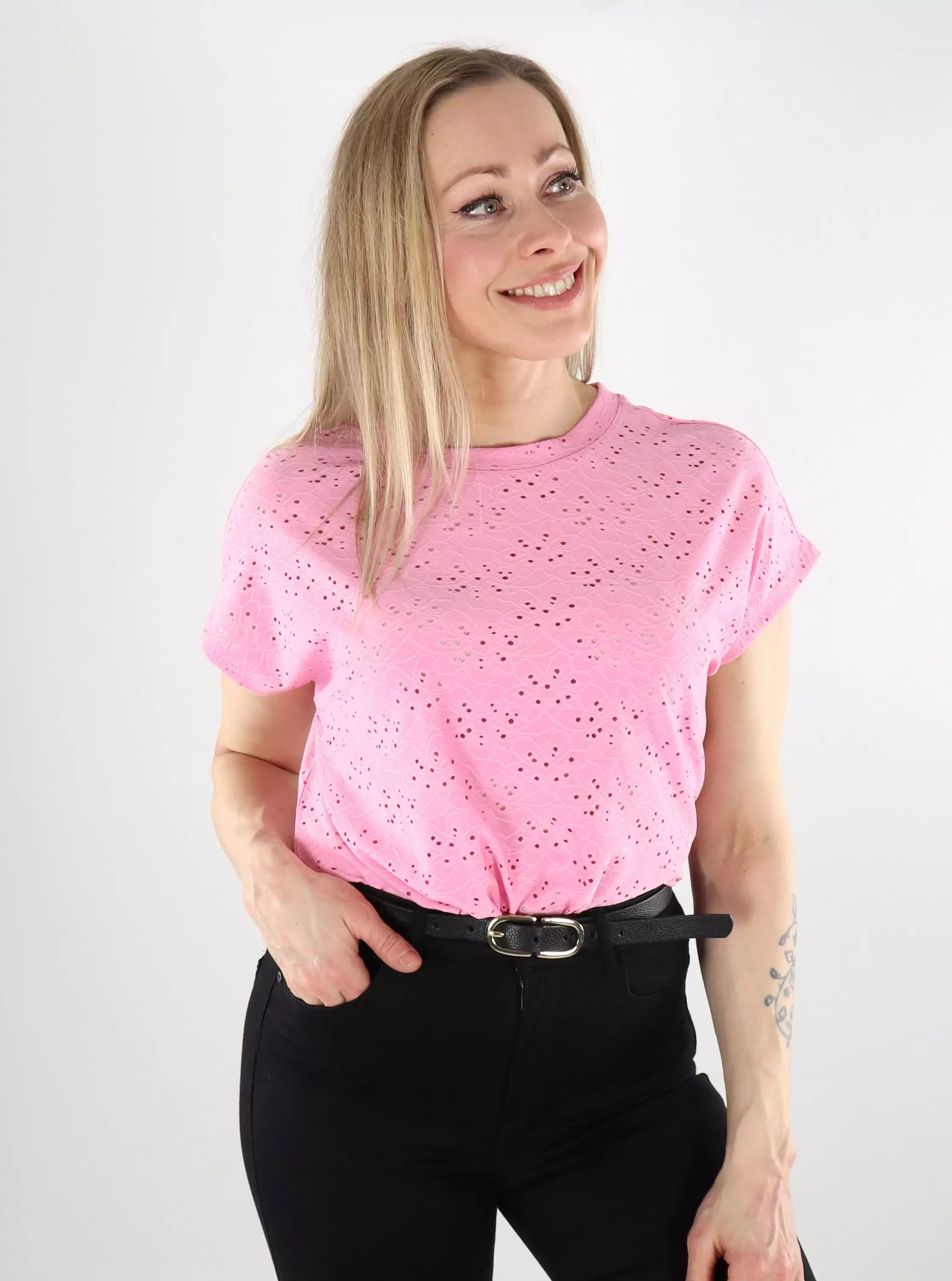 Perforerad, stretchig t-shirt för damer med en rundad och längre bakkant.