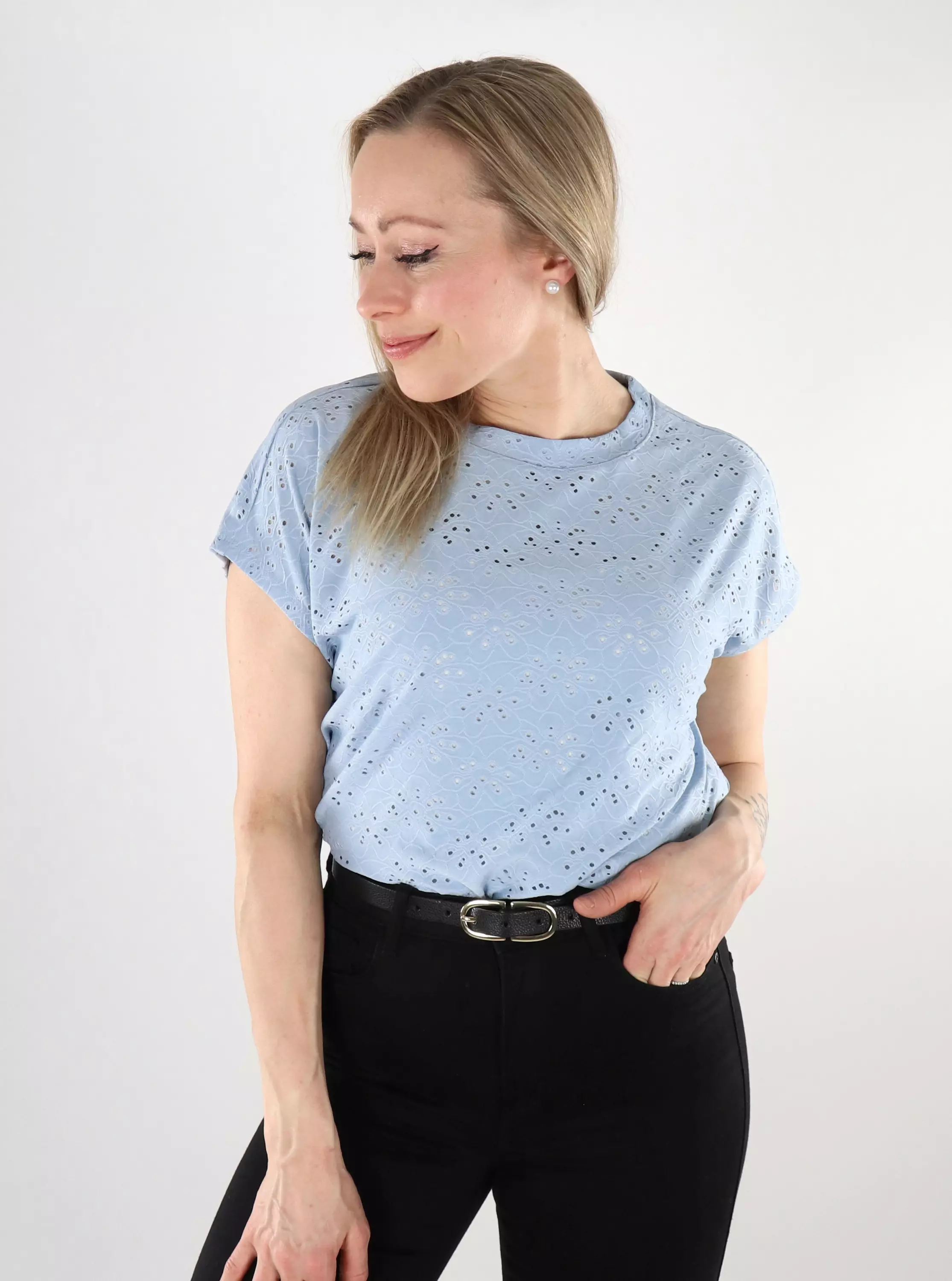 Perforerad, stretchig t-shirt för damer med en rundad och längre bakkant.
