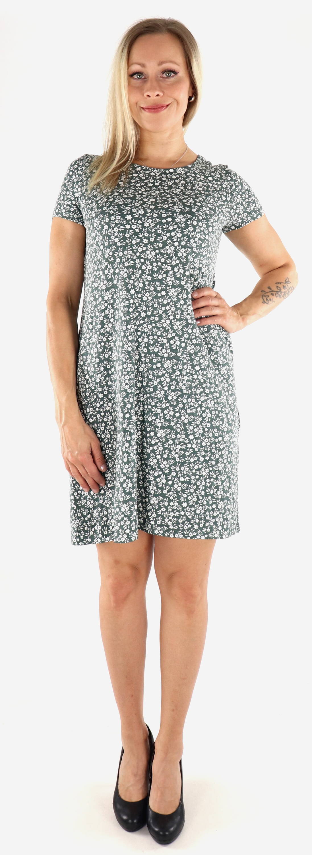 Elastisk klänning med blommönster. Vackra dekorativa sladdar på baksidan.