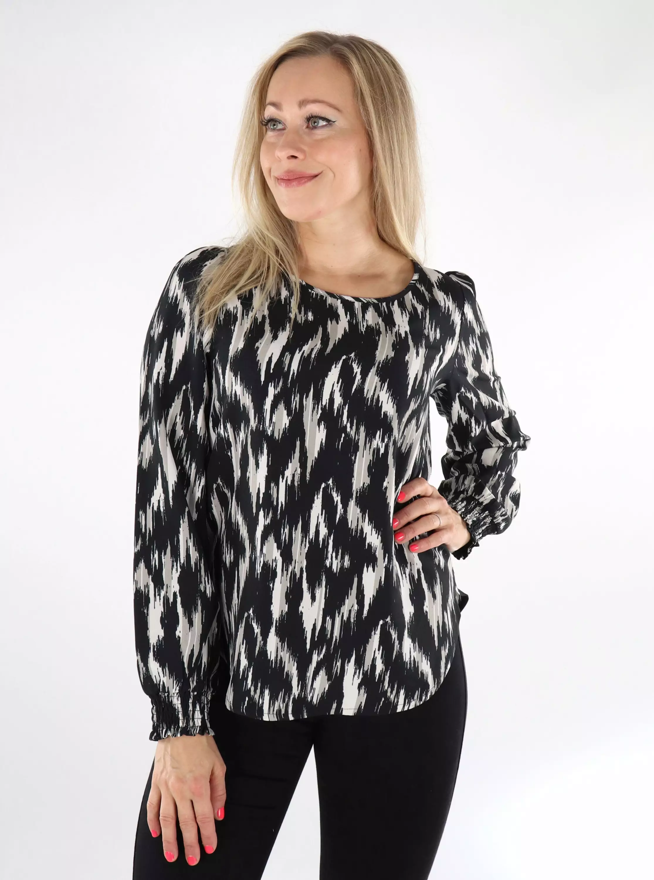 Lätt och mångsidig skjorta med rundad fåll och ribbstickade ärmslut.