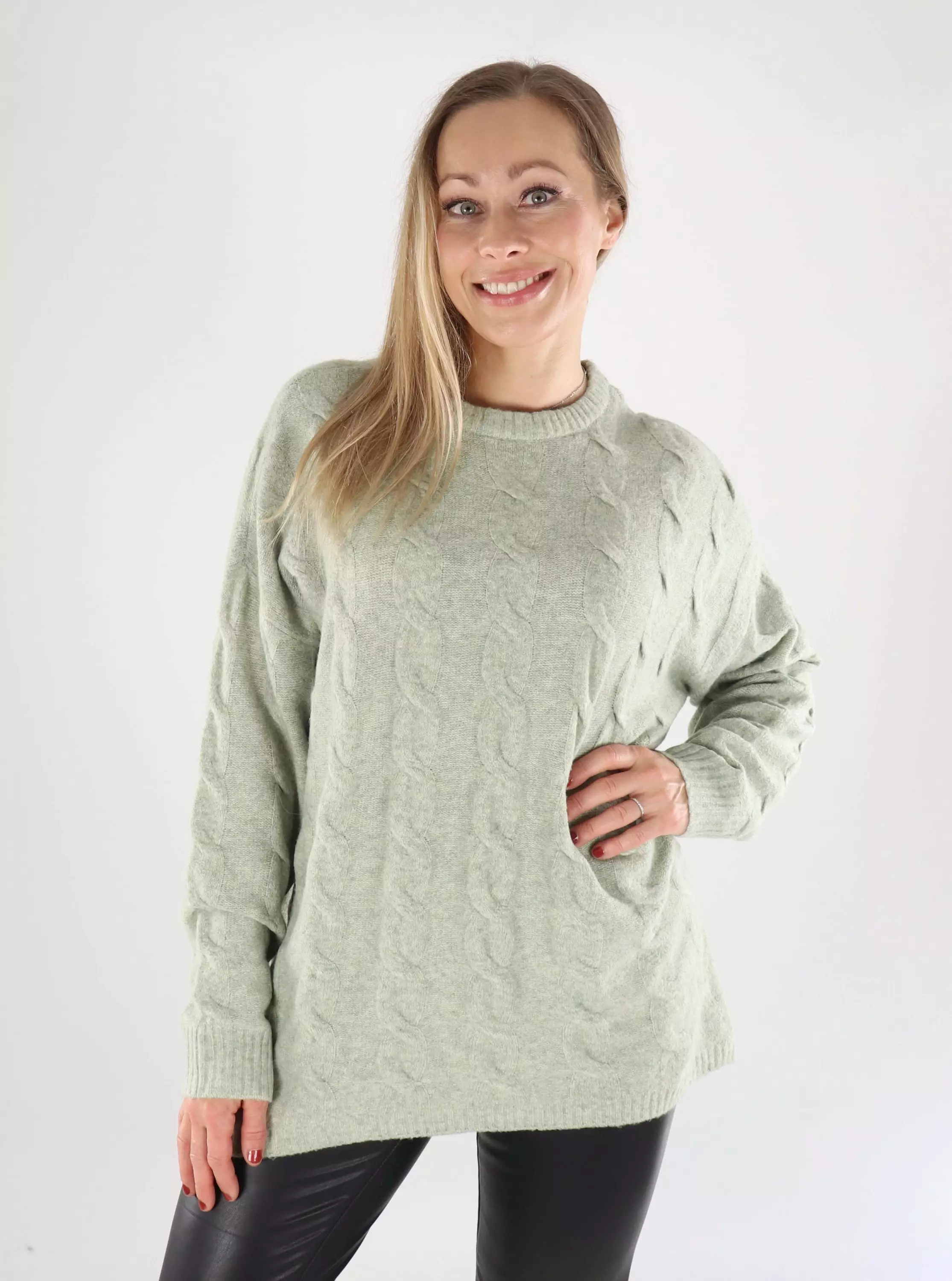 Onlys tröja med längre fåll baktill och en vacker kabelstickning. Det behagligt mjuka materialet och den avslappnade passformen gör tröjan till ett enkelt val för vardagsbruk. Passar bra till jeans och leggings.
