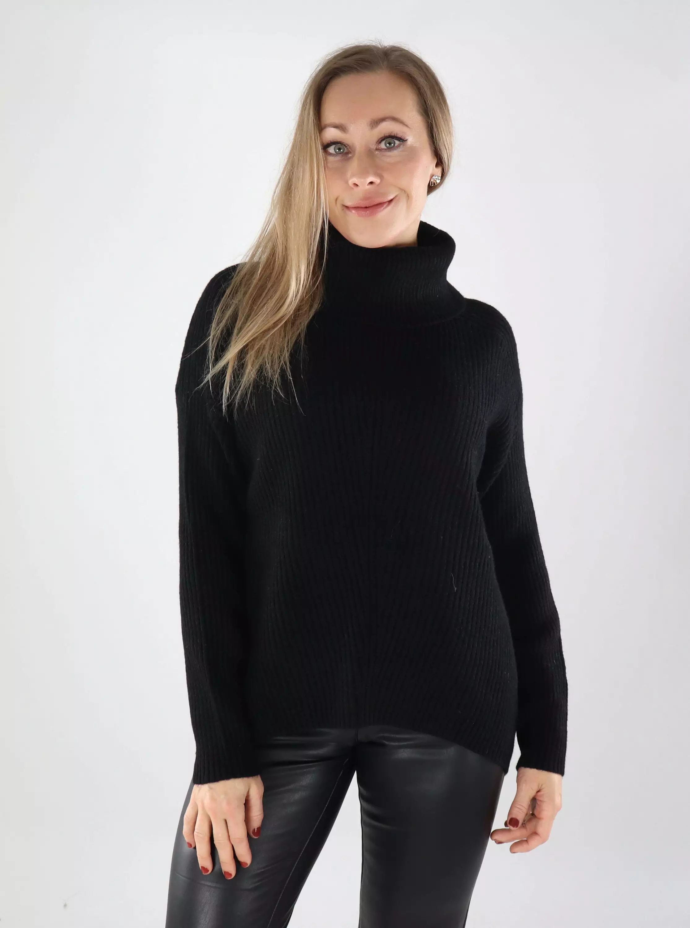 Mjuk tröja med hög halsringning. Något längre fåll bak.