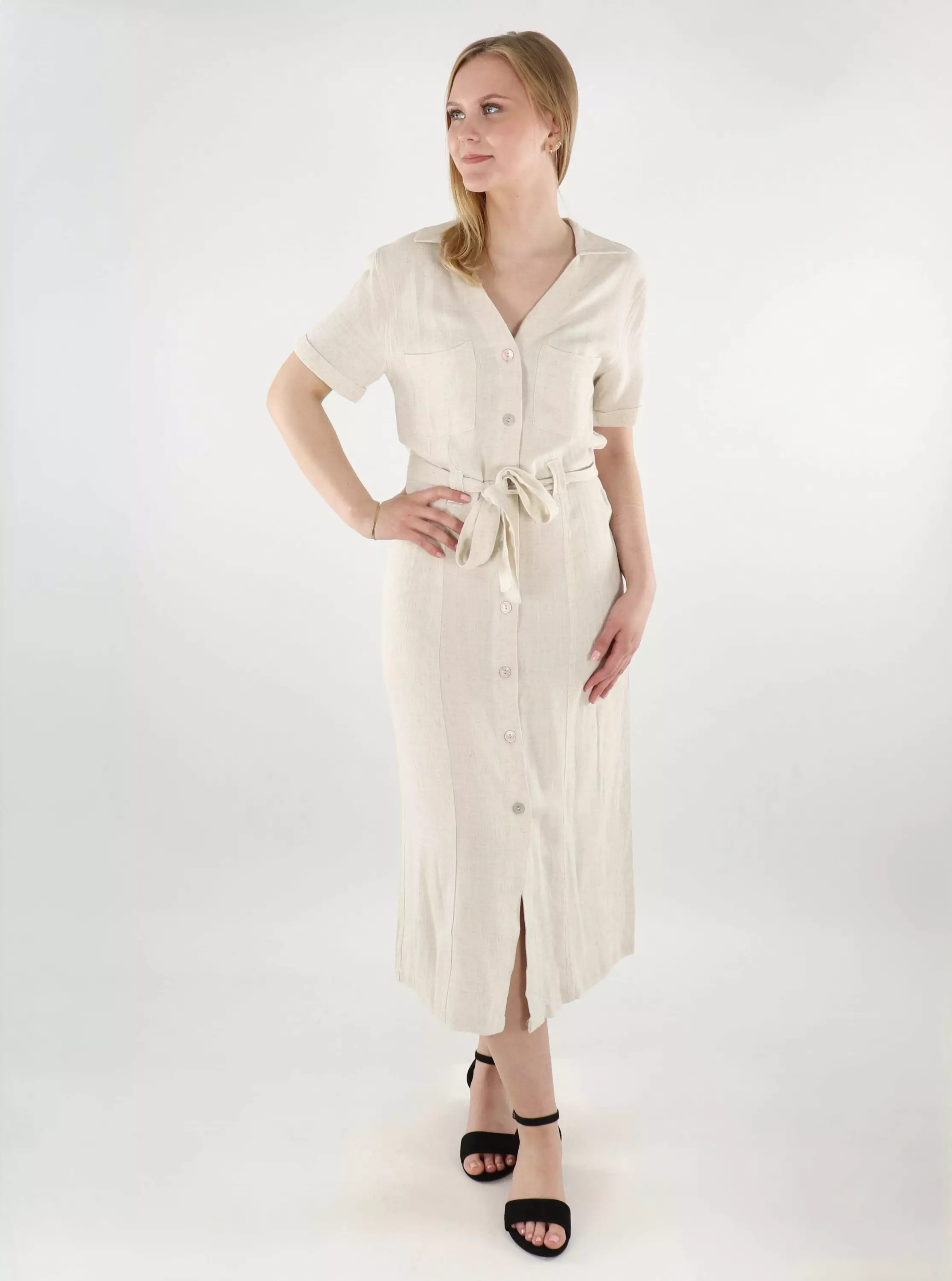 En lätt klänning med knäppning som får dig att känna dig bekväm och snygg. Den mjuka linne-viskosblandningen känns härlig på huden och den justerbara dragsko i midjan skapar en vacker siluett. Perfekt för enkla sommardagar!