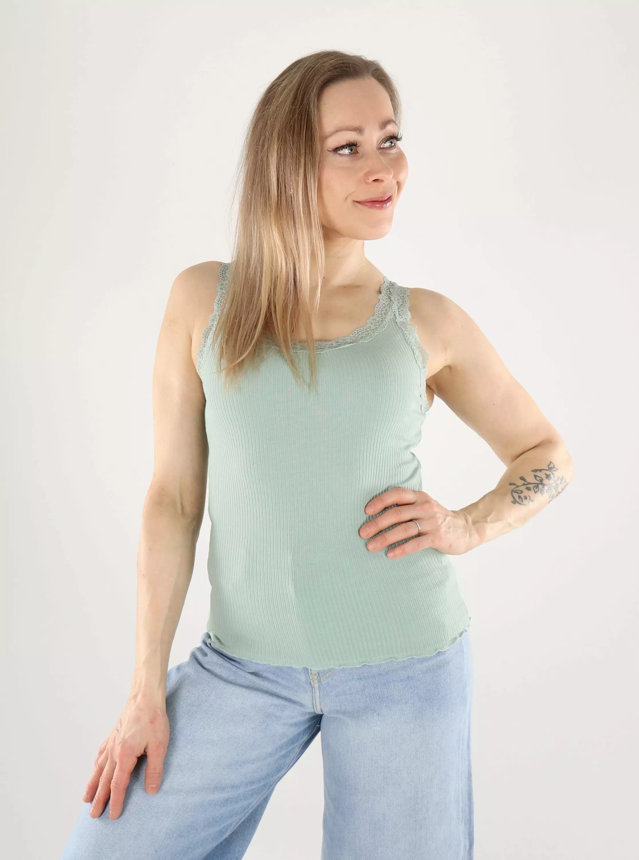 En snygg och mångsidig ribbad topp med en vacker spetskantad halsringning som ger en touch av femininitet. Det bekväma, stretchiga materialet sitter bra och känns bekvämt hela dagen. Lätt att kombinera med jeans och kjolar!