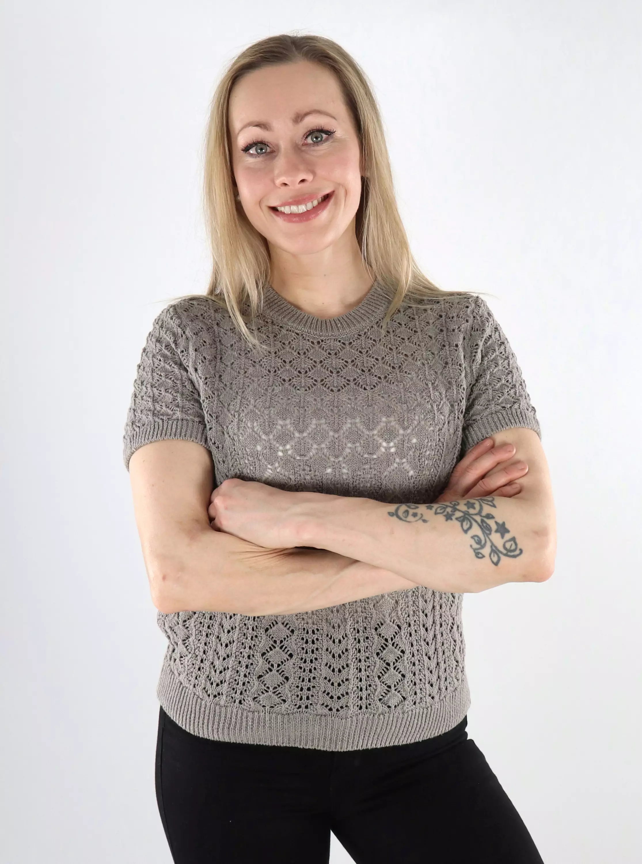 En t-shirt gjord i ett vackert spetsmönster. Materialet i skjortan är en återvunnen bomullsblandning, som känns bekväm och andas på huden.