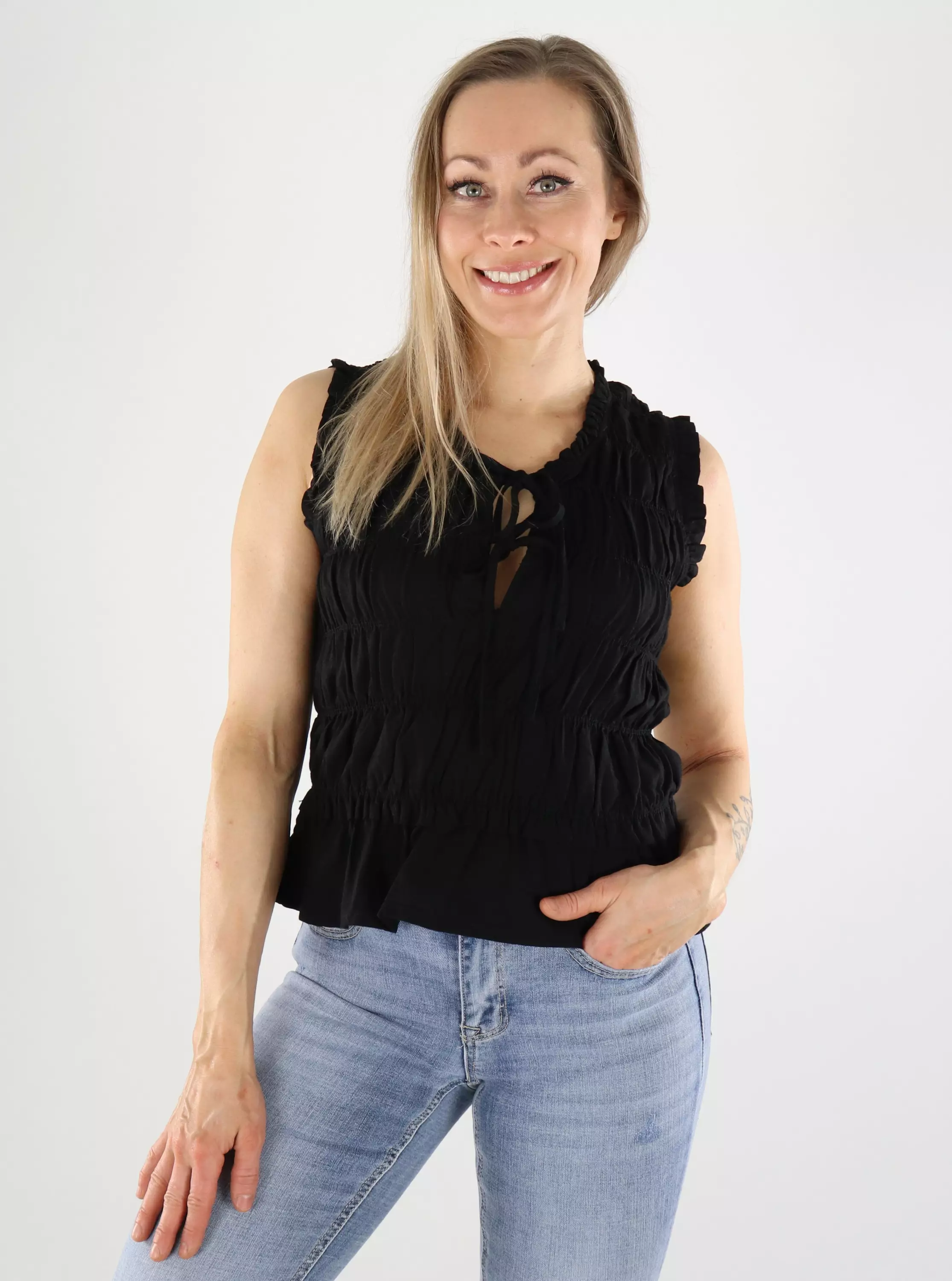 Skapa en mjuk och snygg look med denna ONLY volangtopp. Toppen har vackra veck och knytband framtill.