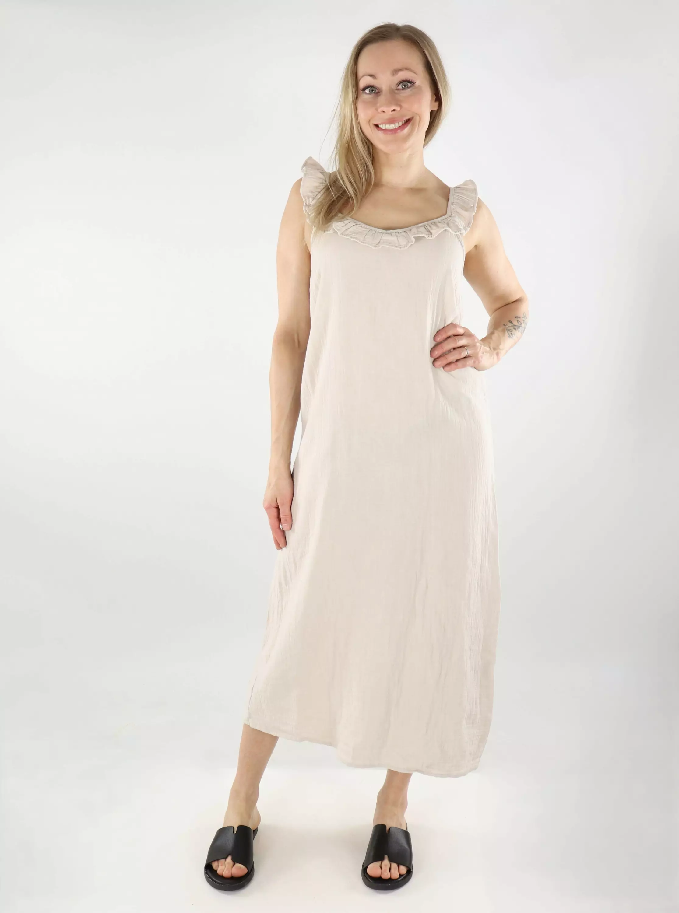 Pieces ekologiska bomullsklänning är den perfekta kombinationen av komfort och feminin stil. Den avslappnade skärningen och de volangerade banden skapar en lätt och somrig look!